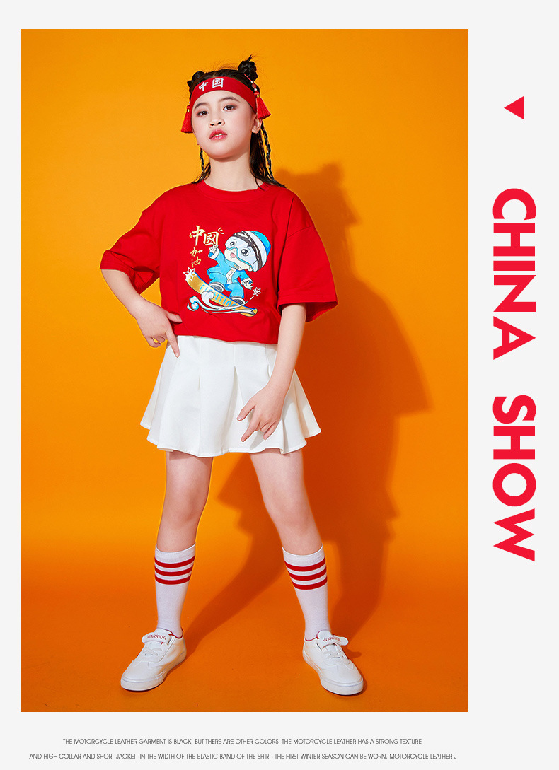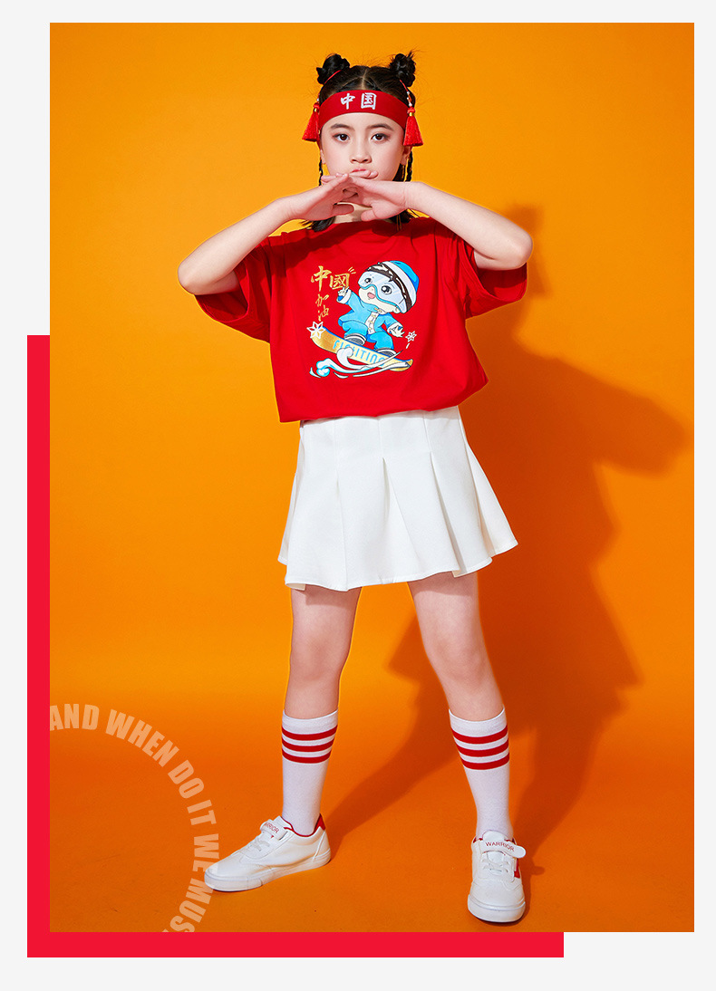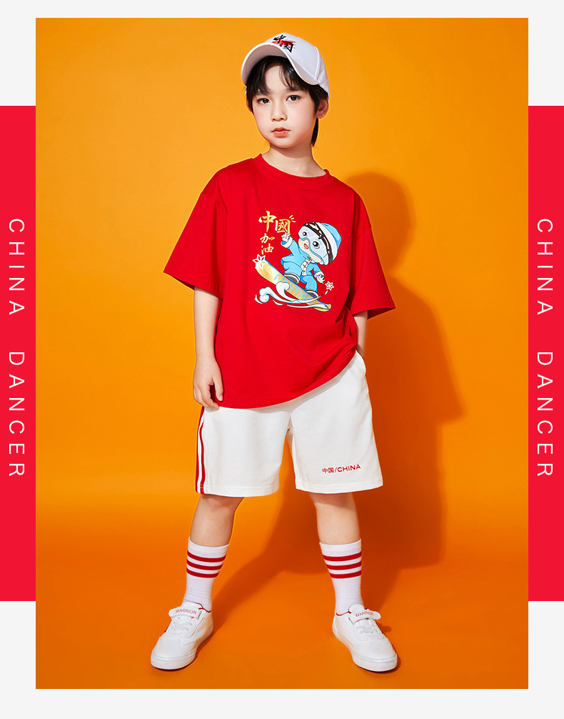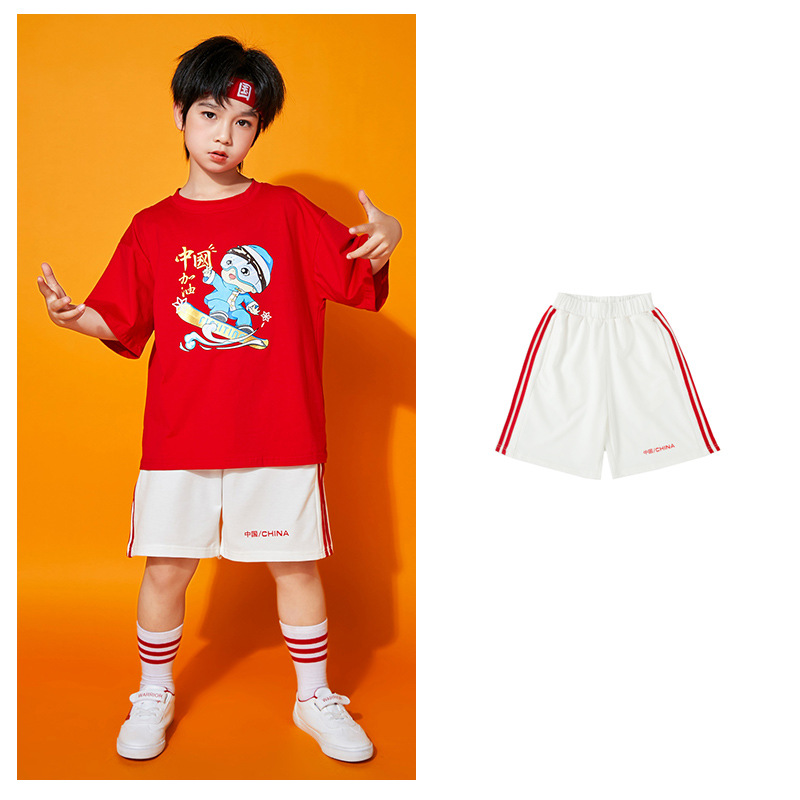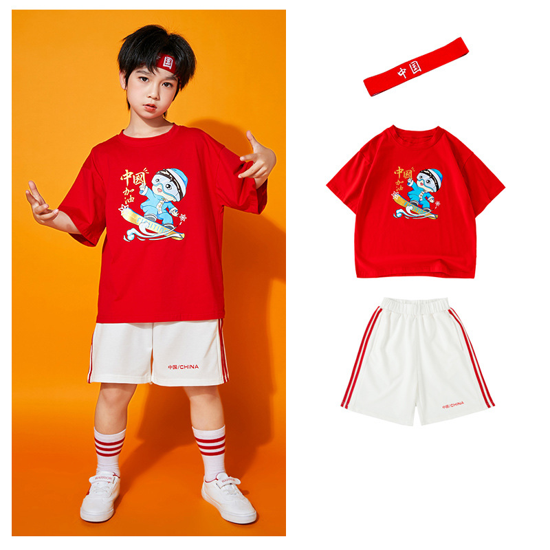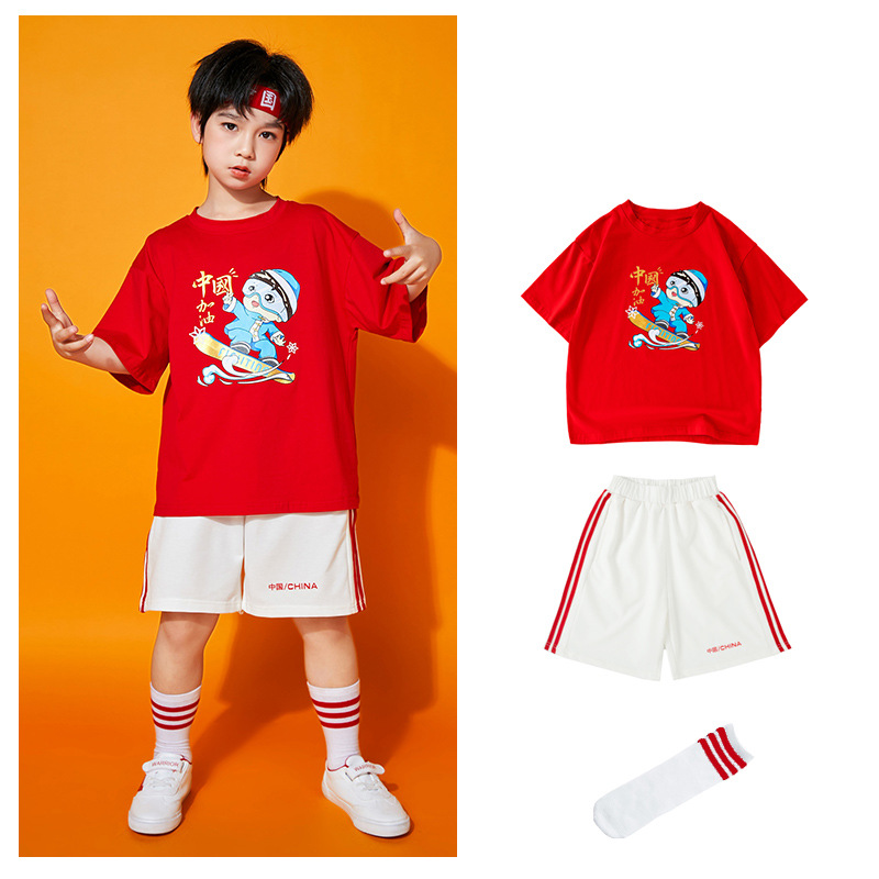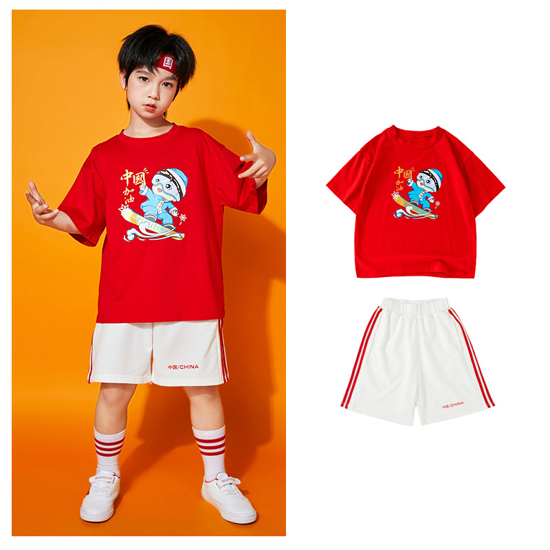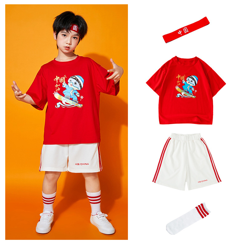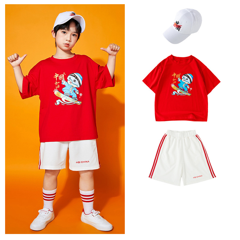 어린이 치어리딩 팀 합창 의상 중국 급유 빨간 반팔 세트 초등학생 게임 의상