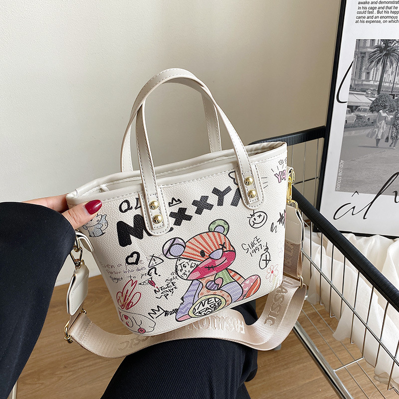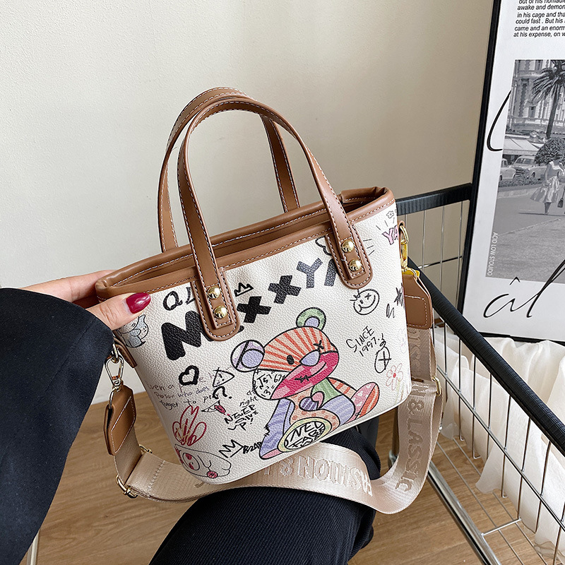 여성용 대용량 핸드백 2024 신상 한국 스타일 트렌디 다용도 개성 그래피티 숄더백 만화 버킷백 크로스백스토어 가기