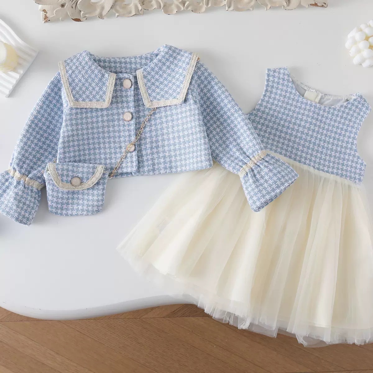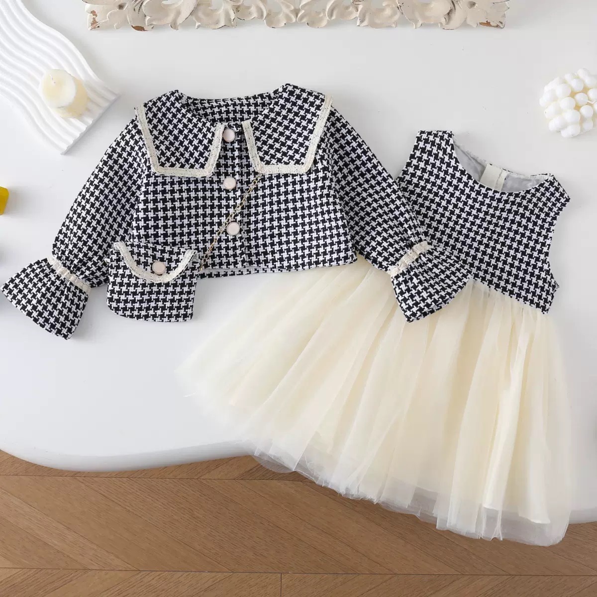 새우 격자 작은 향기로운 스타일 라펠 재킷 스플 라이스 메쉬 스커트 드레스 무료 가방 3 피스 세트 소녀 가을, 겨울 새로운 스타일