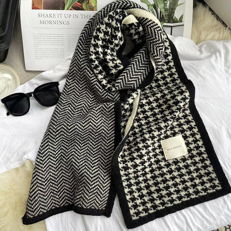 Houndstooth 스카프 니트 새로운 바느질 학생 따뜻한 목 겨울 한국 예술 울 격자 무늬 스카프 여성용스토어 가기