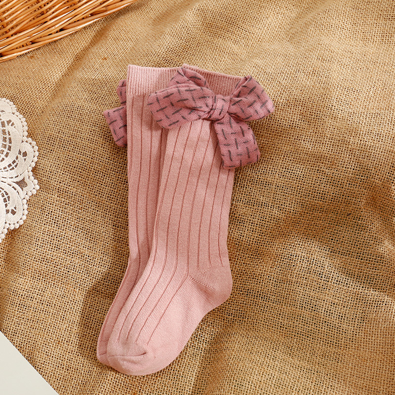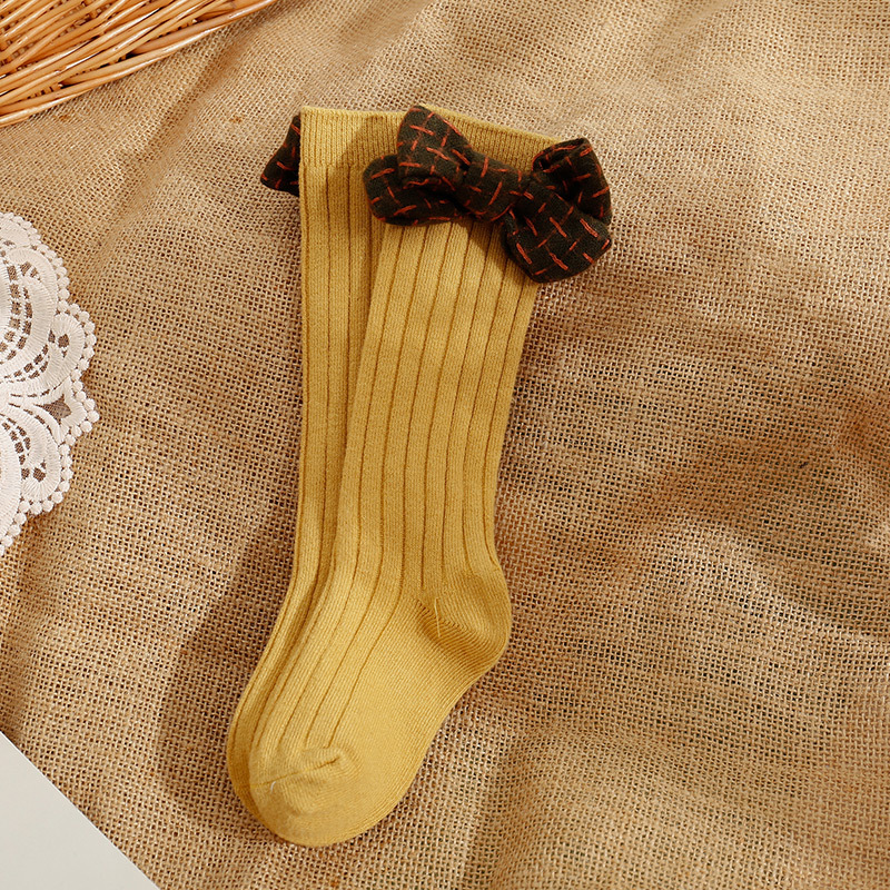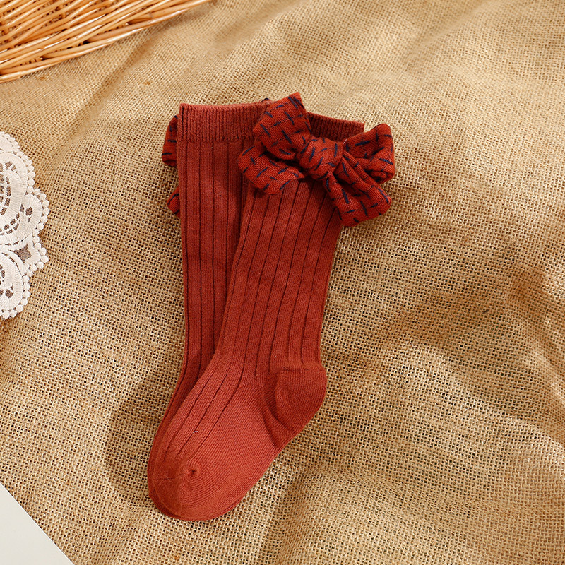 2022ins 스페인 어린이 구덩이 양말 격자 무늬 플란넬 활 아기 양말 중간 길이 스타킹 아기 양말