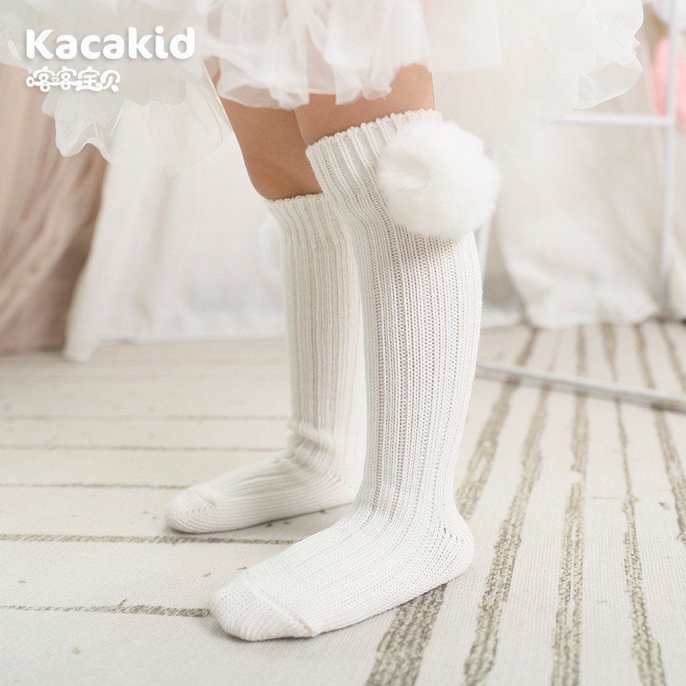 두꺼운 라인 니트 튜브 양말 겨울 새로운 어린이 양말 아기 소녀 따뜻한 면화 양말 패션 토끼 모피 빅 볼 더미 양말