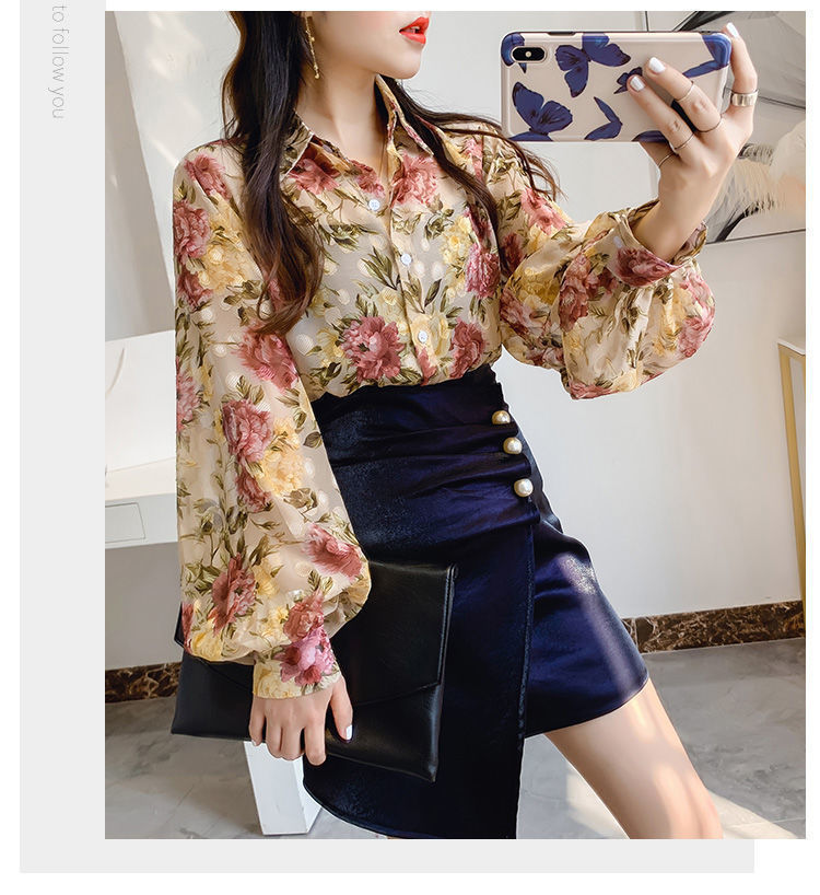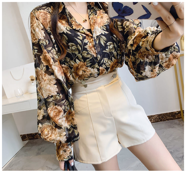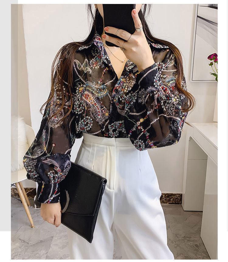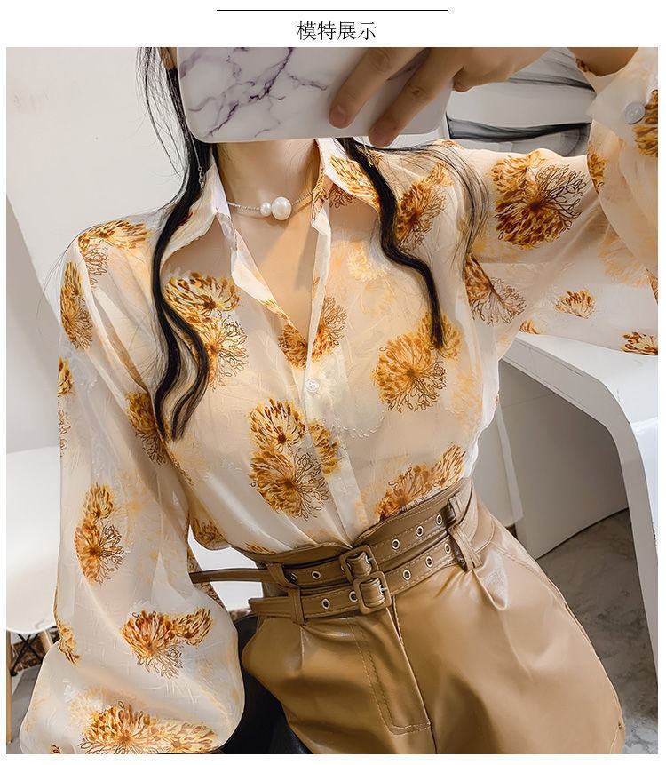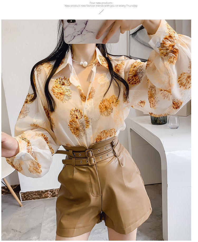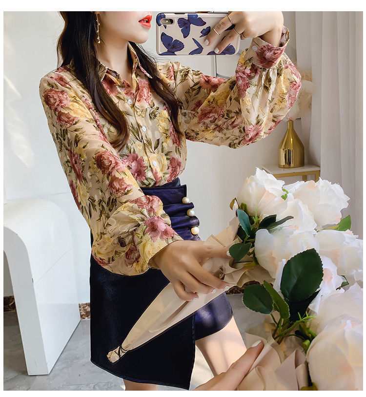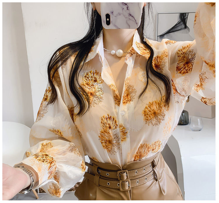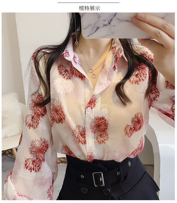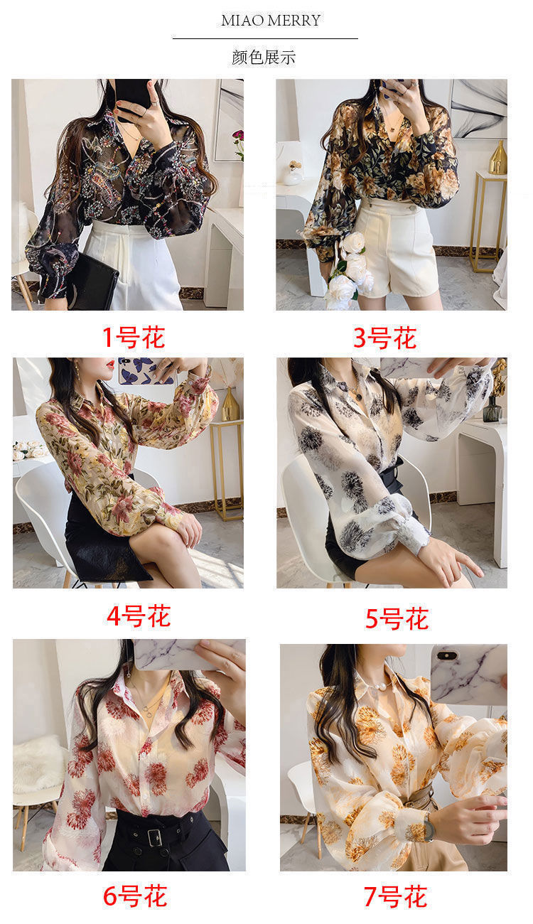 섹시한 관점 에어컨 셔츠 태양 보호 의류 여성용 2022 여름 새로운 스타일 우아한 프린트 랜턴 슬리브 쉬폰 꽃 셔츠스토어 가기
