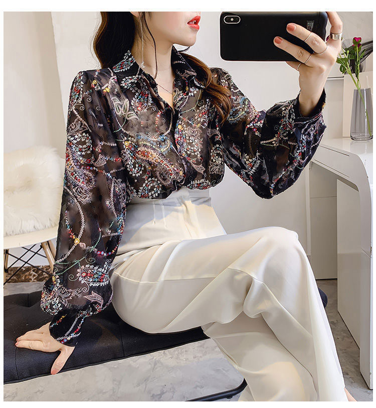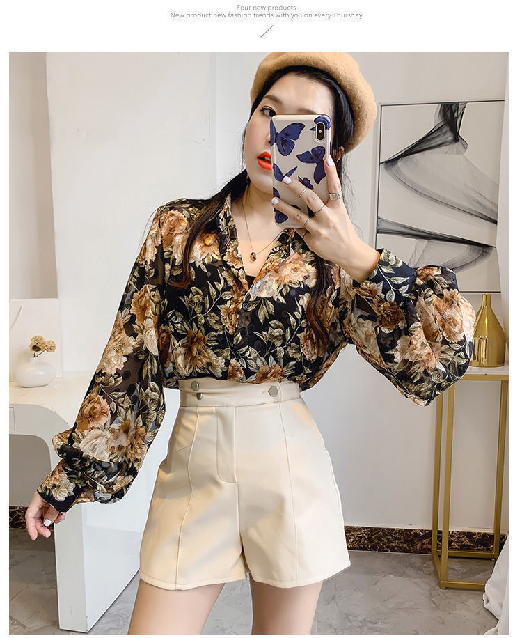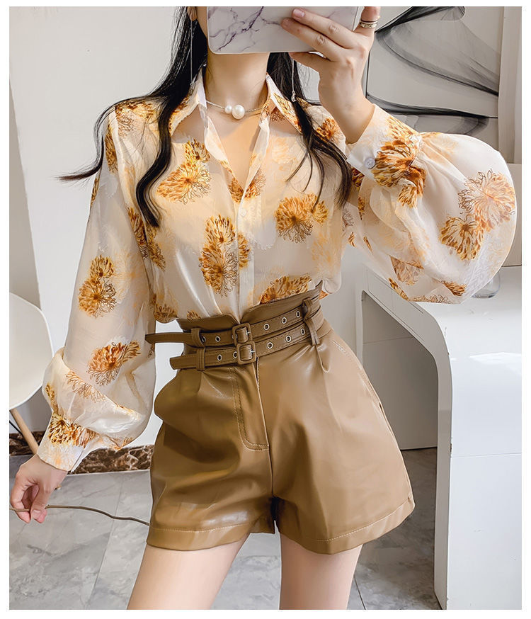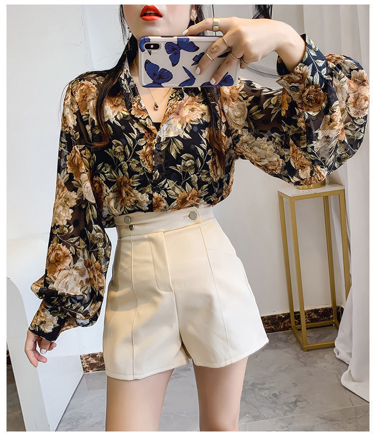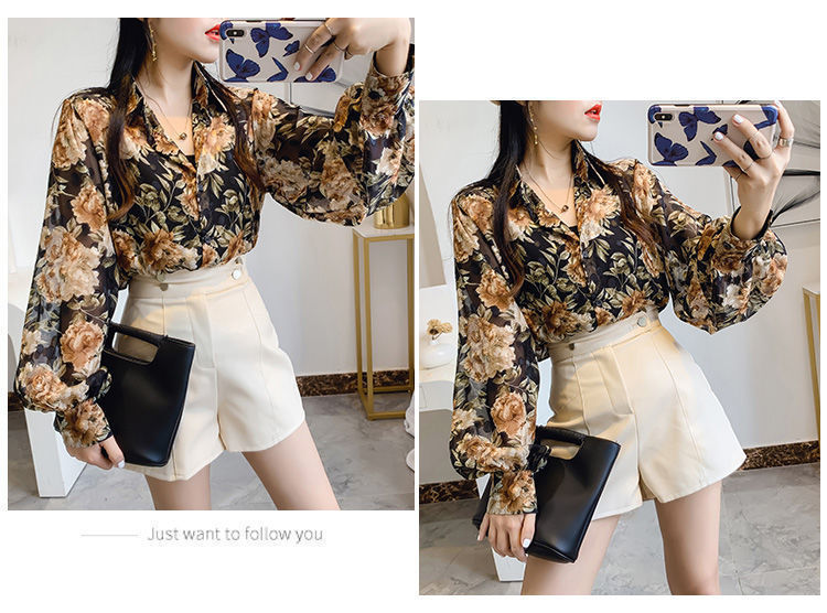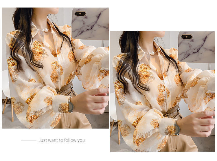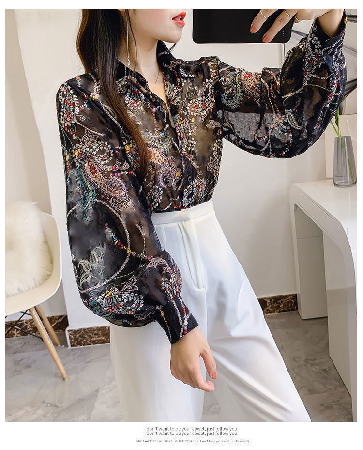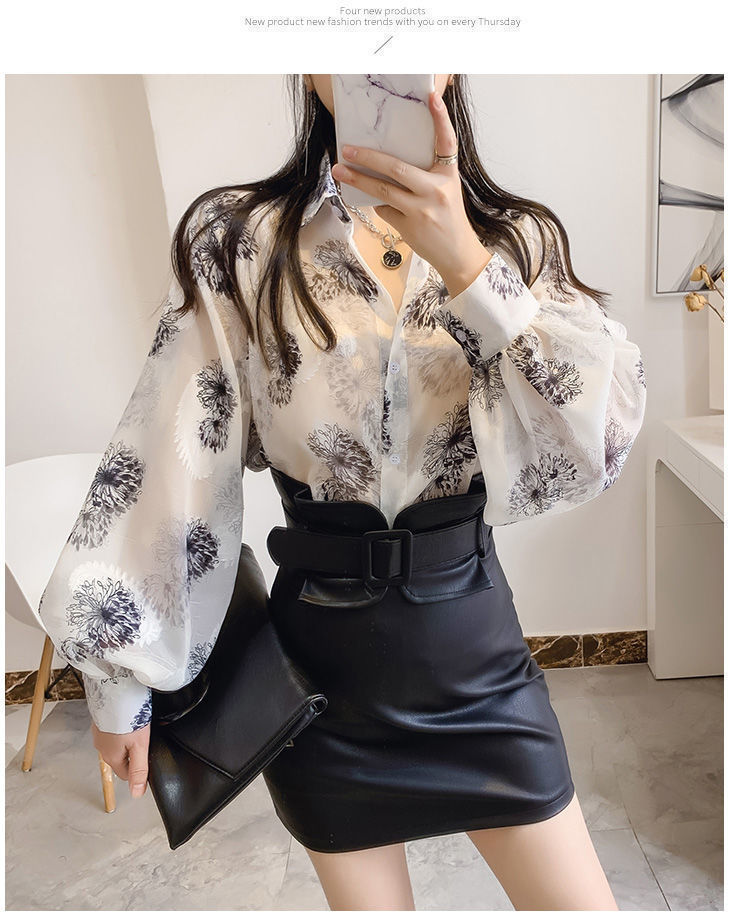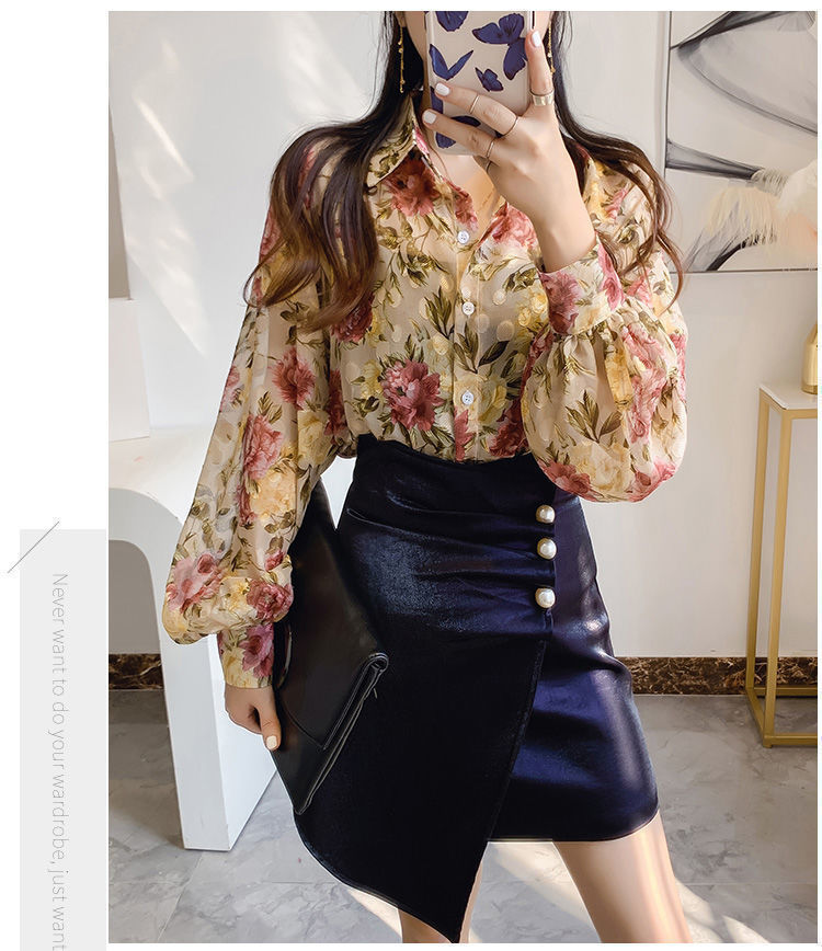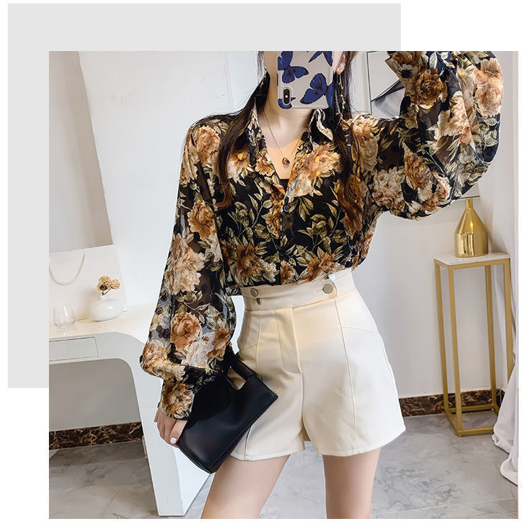 섹시한 관점 에어컨 셔츠 태양 보호 의류 여성용 2022 여름 새로운 스타일 우아한 프린트 랜턴 슬리브 쉬폰 꽃 셔츠스토어 가기