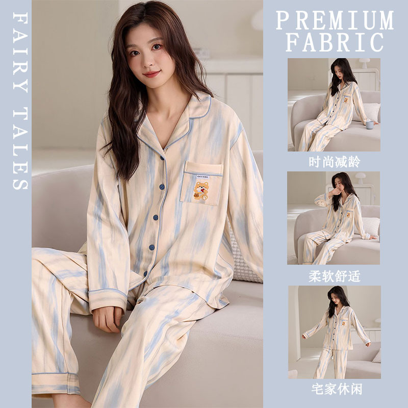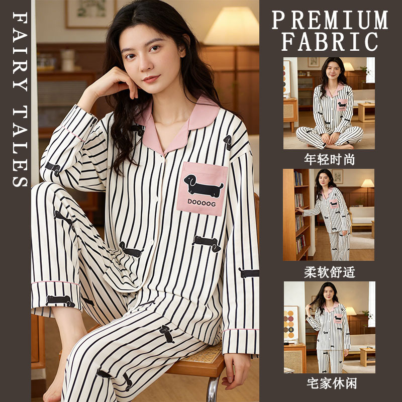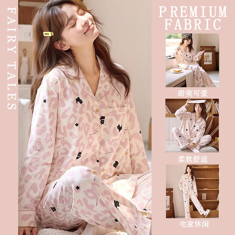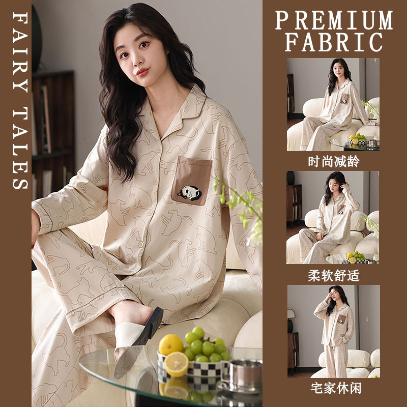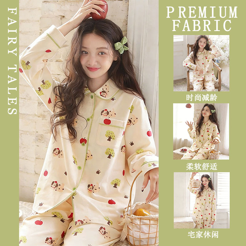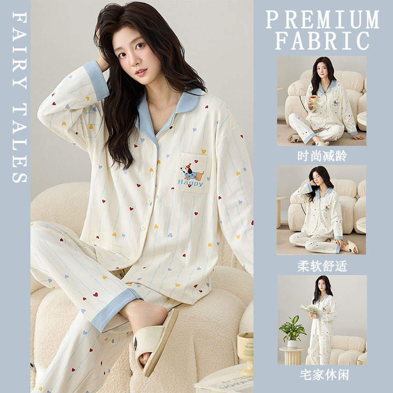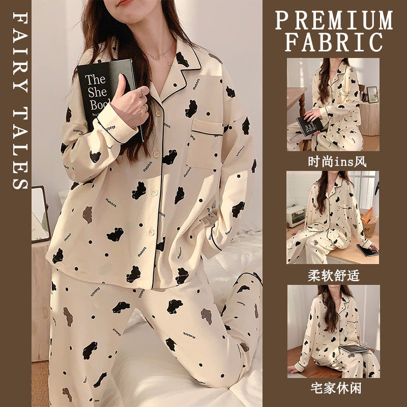 여성을위한 한국 스타일 봄, 가을 모조 면화 잠옷 갈색 사랑 달콤하고 부드러운 INS 스타일 긴팔 바지 홈웨어 세트스토어 가기