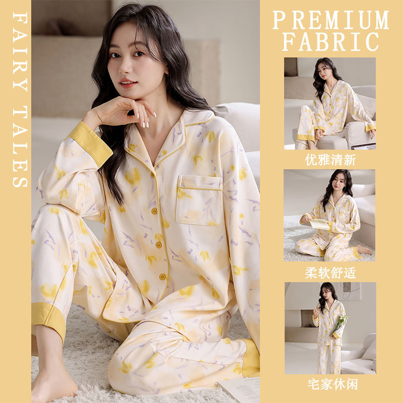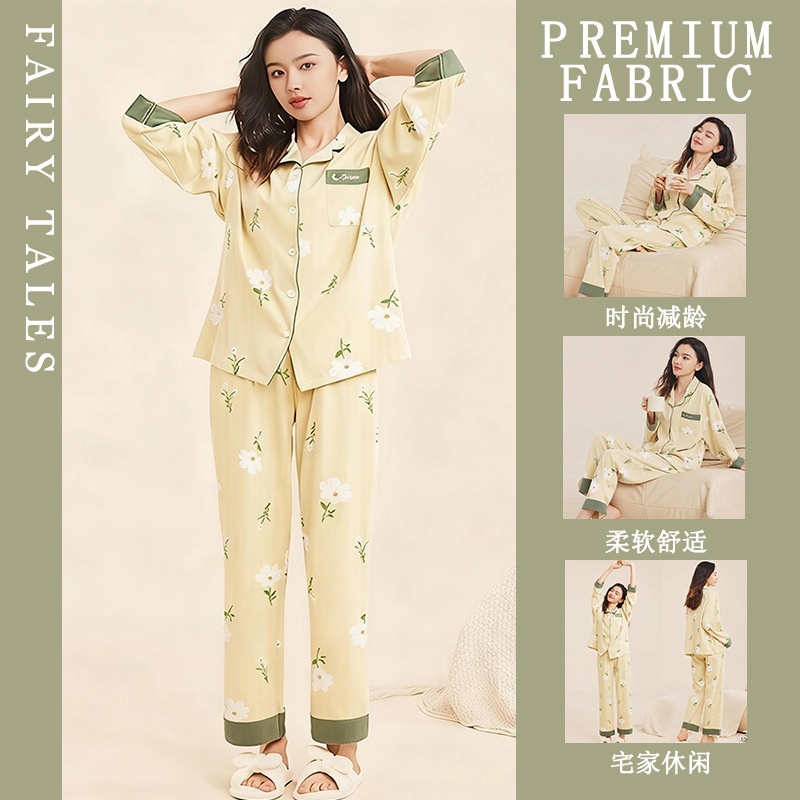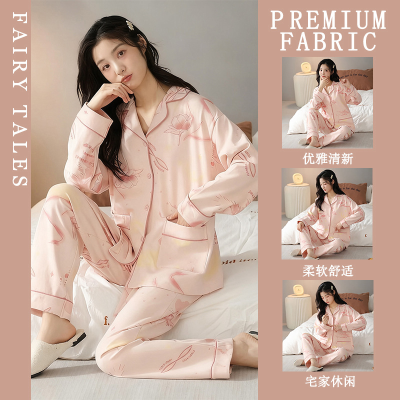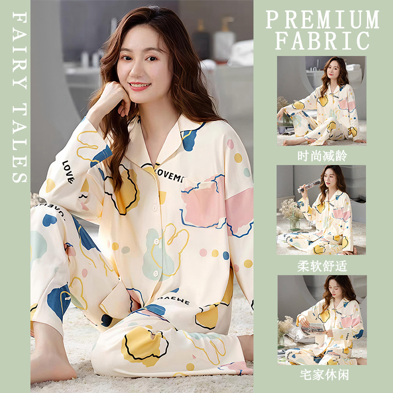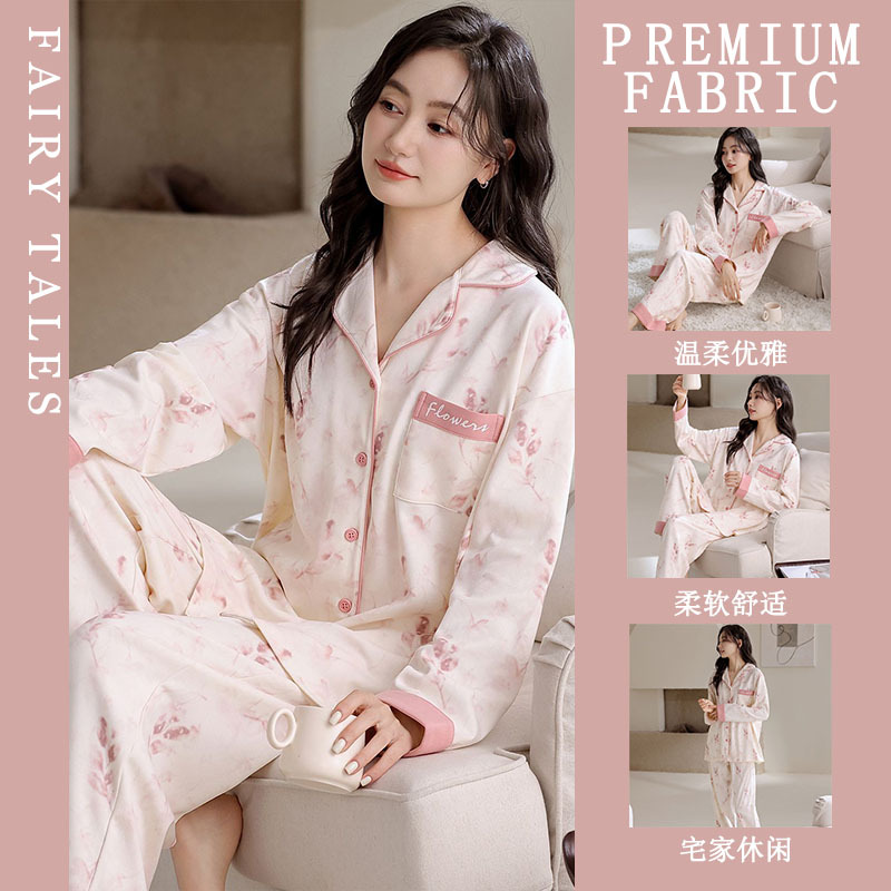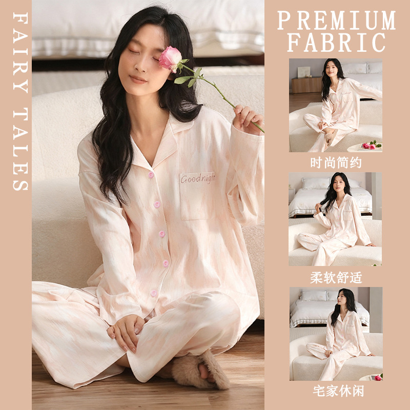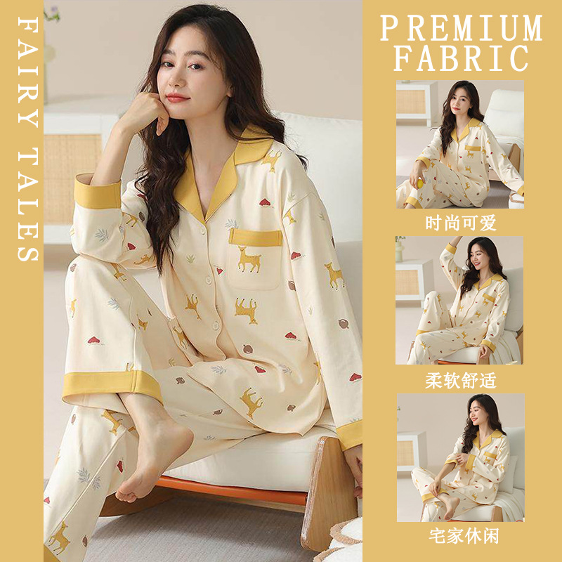 여성을위한 한국 스타일 봄, 가을 모조 면화 잠옷 갈색 사랑 달콤하고 부드러운 INS 스타일 긴팔 바지 홈웨어 세트스토어 가기
