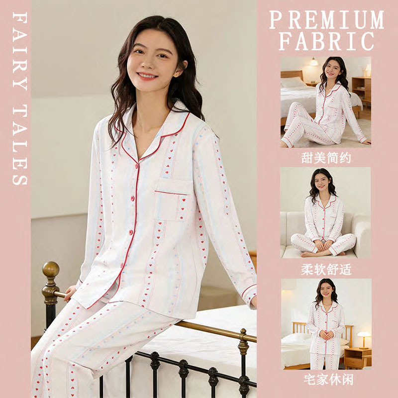 여성을위한 한국 스타일 봄, 가을 모조 면화 잠옷 갈색 사랑 달콤하고 부드러운 INS 스타일 긴팔 바지 홈웨어 세트