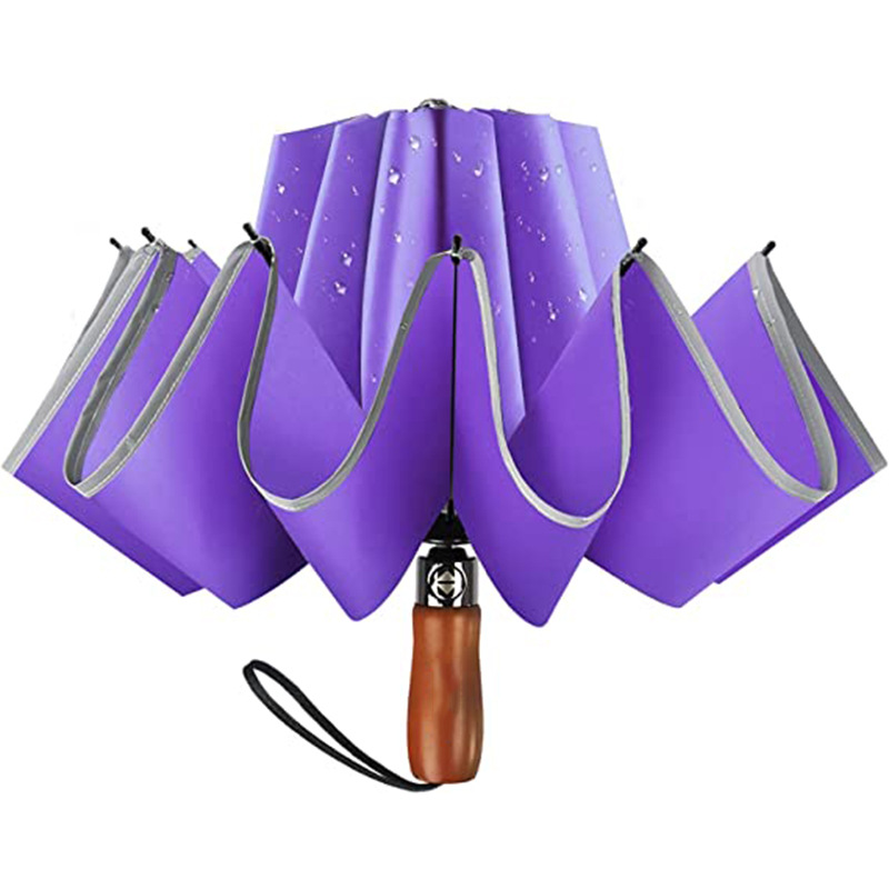 나무 손잡이가 있는 완전 자동 역방향 우산 70% off 우산, 비가 오나 눈이 오나, 원클릭 개폐, 휴대용 자동차 역방향 접이식 우산