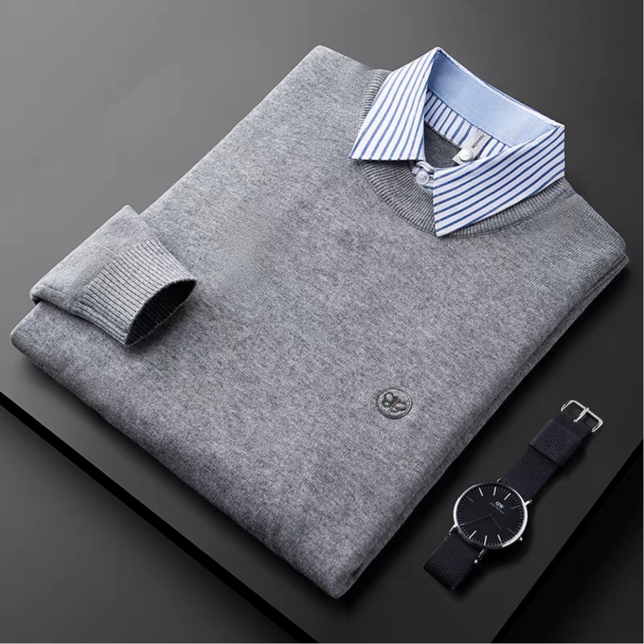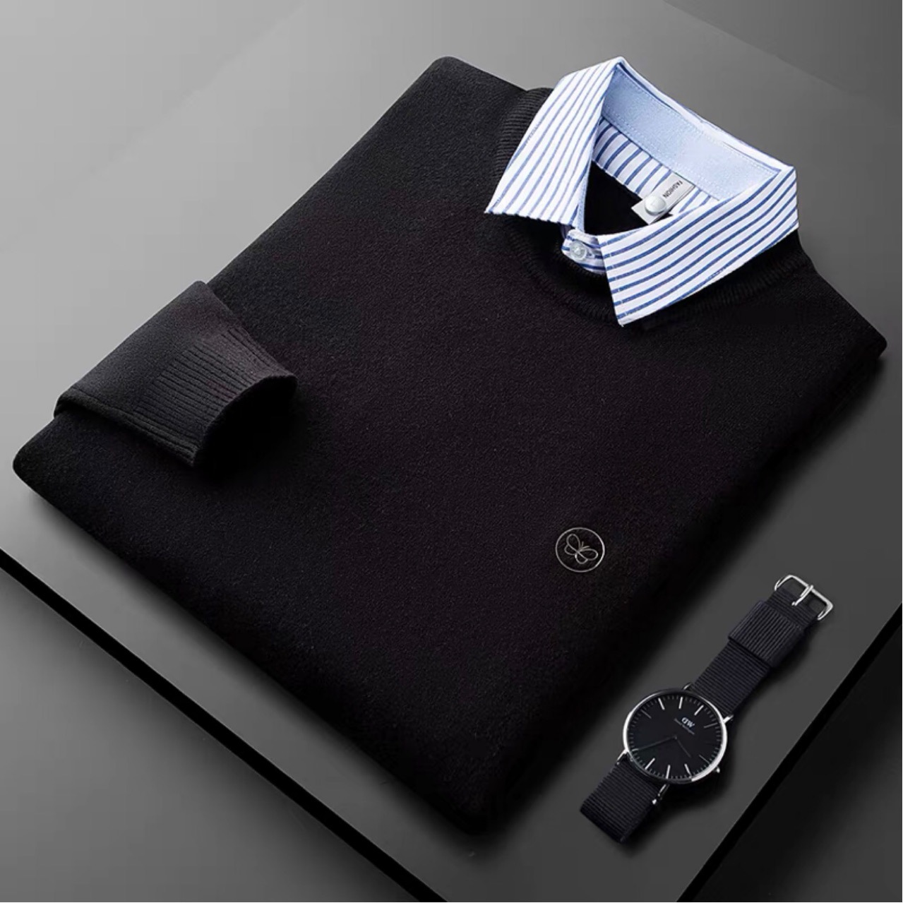 가을 얇은 스트라이프 셔츠 칼라 스티칭 가짜 투피스 화이트 스웨터 남성용 슬림핏 비즈니스 캐주얼 니트웨어 남성