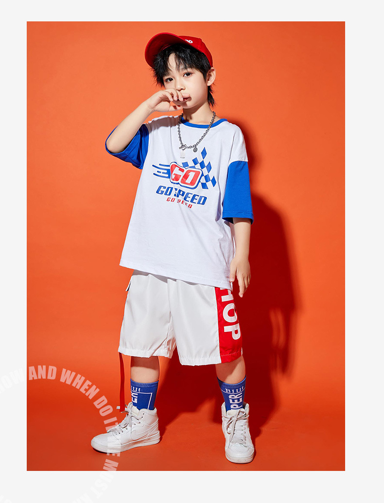 • 8263 남자 GO 블루 슬리브 화이트 탑 + 8073 화이트와 레드 반바지 + 레드 야구 모자