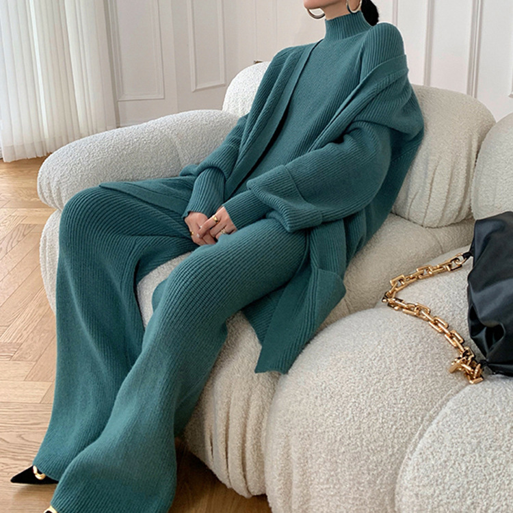 가을과 겨울 2023 니트 슈트는 여성을위한 새로운 고급 패션 와이드 레그 팬츠 스웨터 카디건 3 피스 세트를 두껍게 만들었습니다.스토어 가기