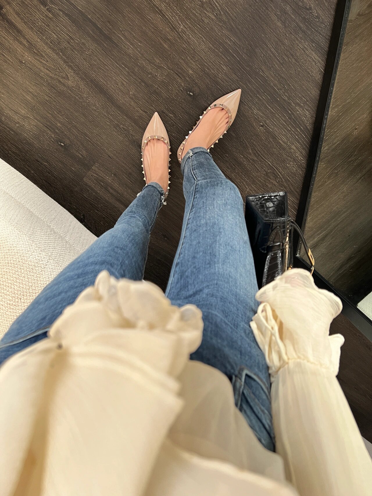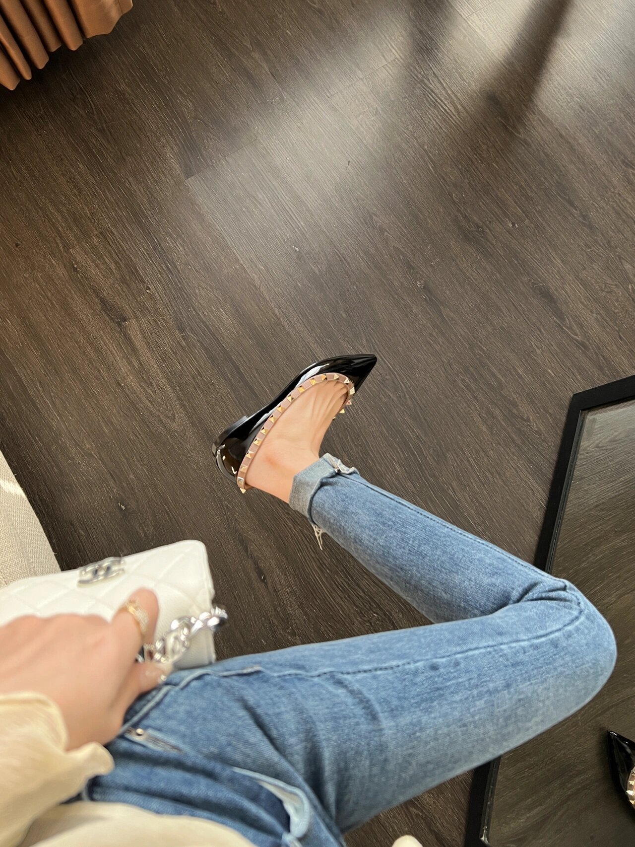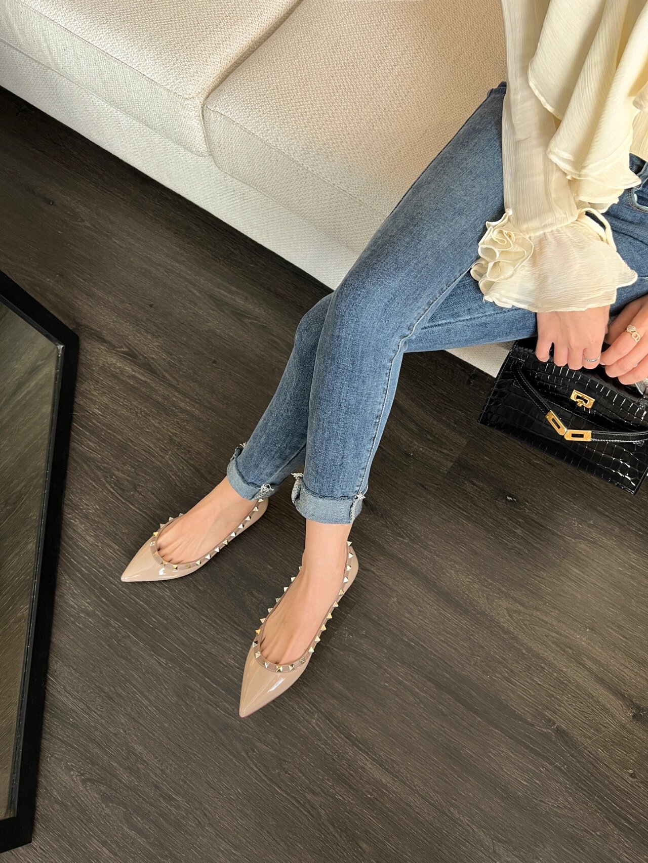 재고 있음~V 브랜드 키높이 5cm 리벳 장식 뮬 슈즈 누드 컬러 뾰족코 소프트 에나멜 가죽 여성용 통근 플랫 슈즈