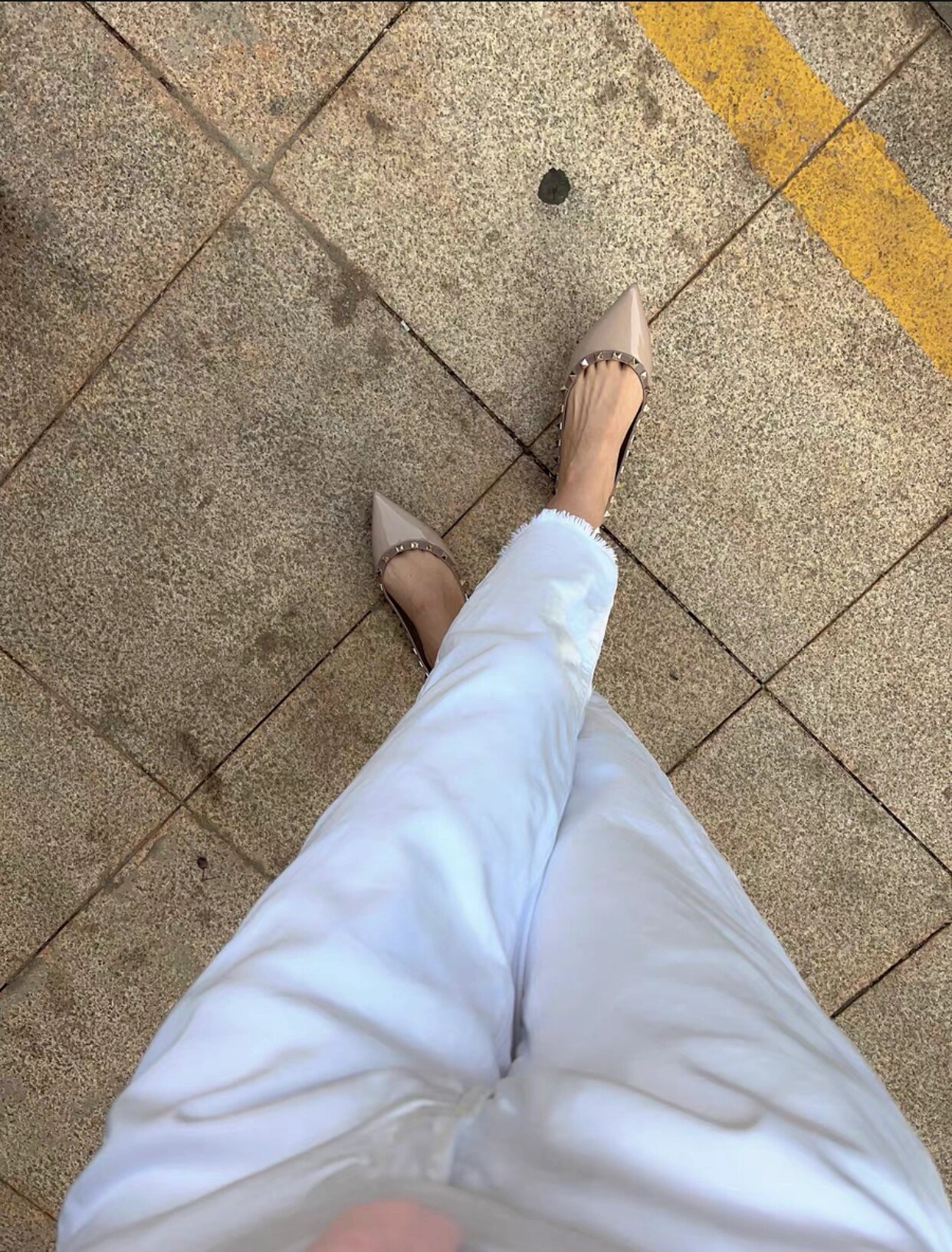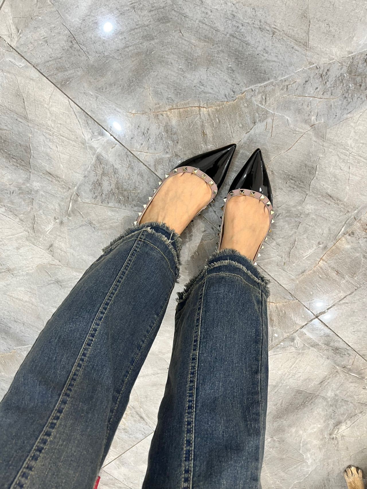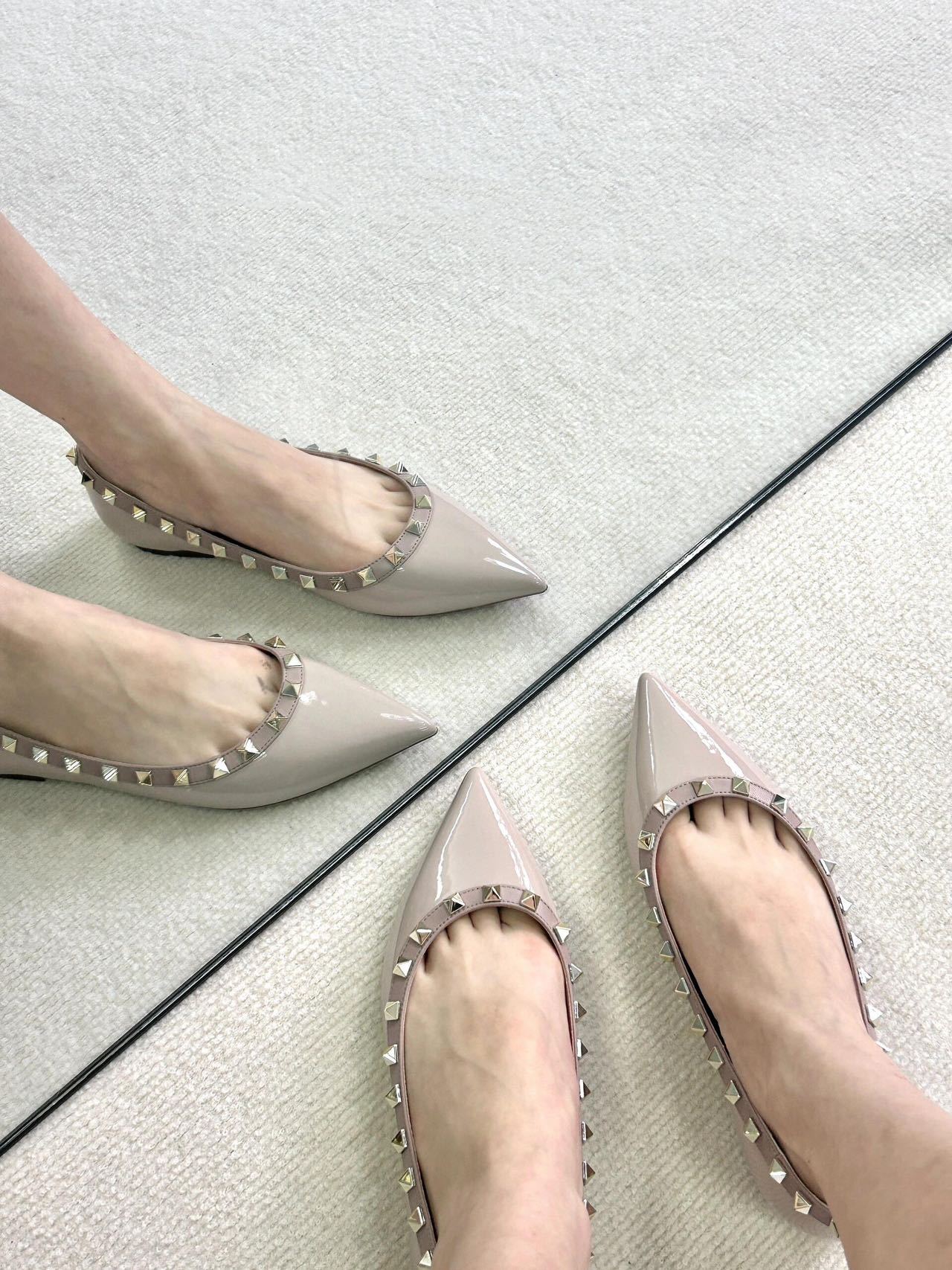 재고 있음~V 브랜드 키높이 5cm 리벳 장식 뮬 슈즈 누드 컬러 뾰족코 소프트 에나멜 가죽 여성용 통근 플랫 슈즈스토어 가기