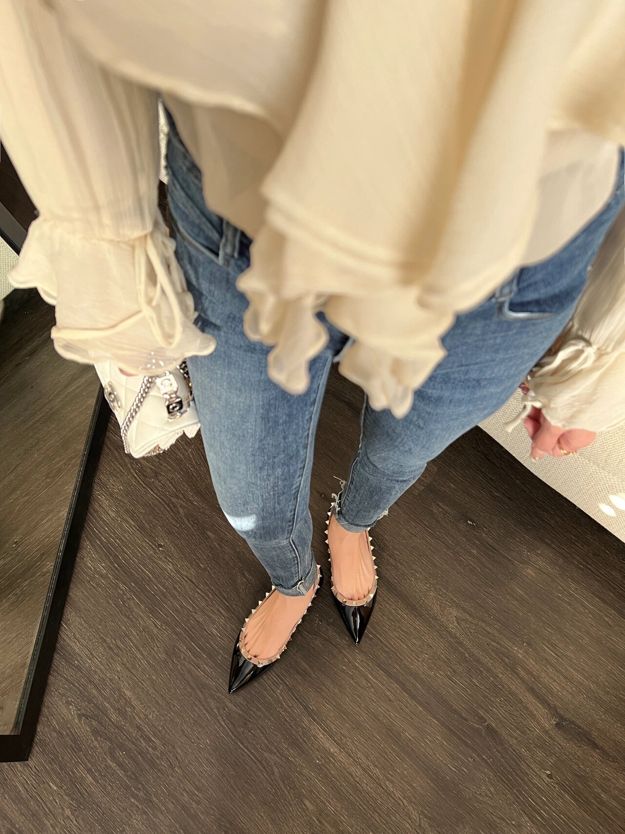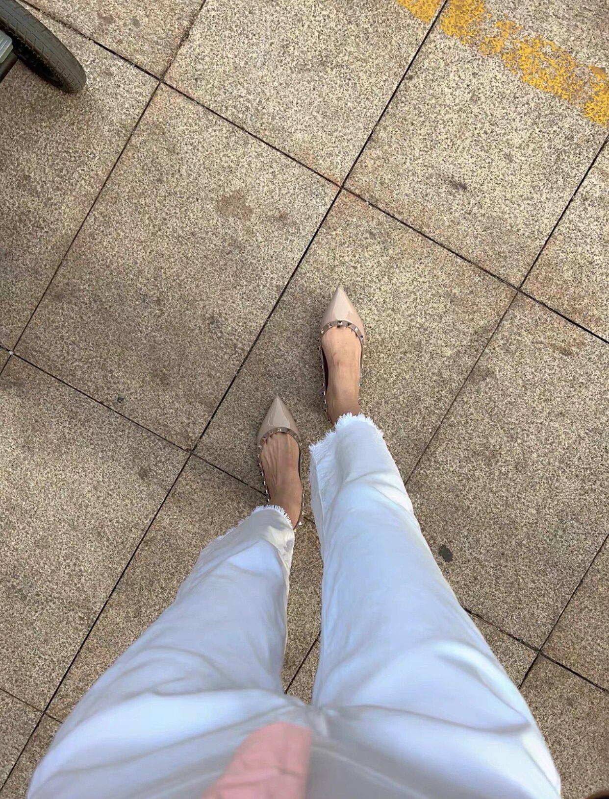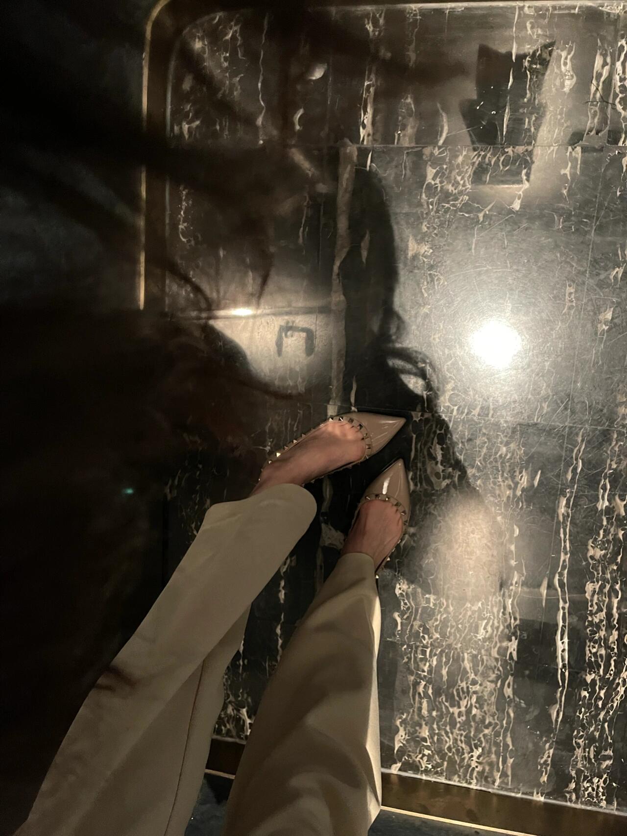재고 있음~V 브랜드 키높이 5cm 리벳 장식 뮬 슈즈 누드 컬러 뾰족코 소프트 에나멜 가죽 여성용 통근 플랫 슈즈스토어 가기