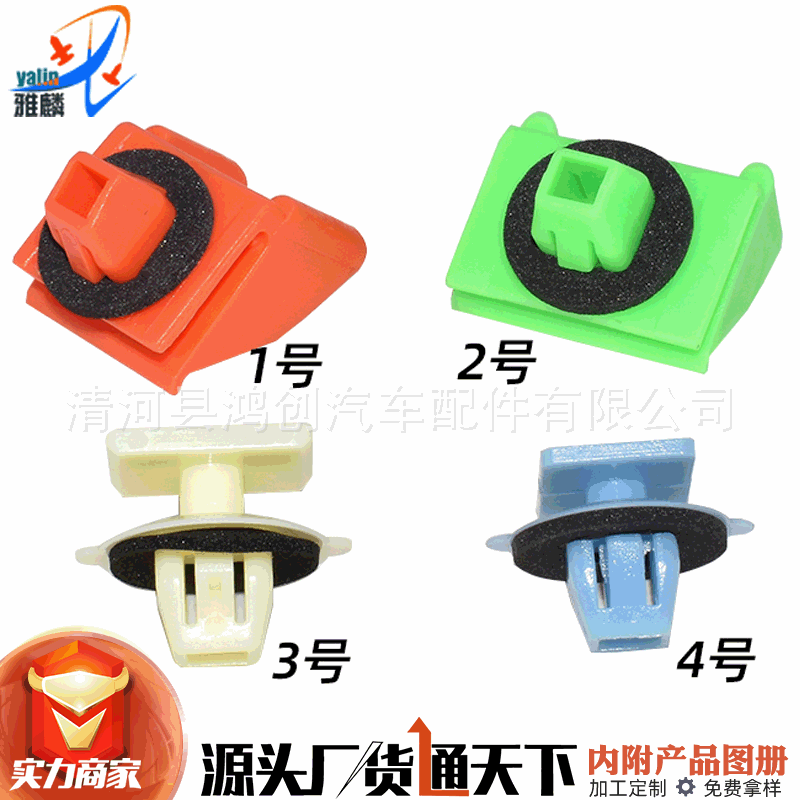 汽车位置用卡扣;汽车顶棚卡扣丰皮铆钉;内饰板卡扣;门饰板卡扣;护板卡扣;底边梁卡扣;座椅卡扣固定卡子;灯扣快丝座子贡螺丝;汽车锁扣;流水条卡扣;后备箱卡扣;叶子板内衬卡扣;机盖隔热板卡扣;隔热棉卡子;密封条卡扣;轮门卡扣;支撑杆卡扣;玻璃托卡扣;玻璃扣;脚垫卡扣;子母扣;双合扣;压条卡扣;保险杠卡扣(前杠 后杠);中网卡扣;机盖扣;穿芯钉;穿心钉;窗帘扣;地板扣;地毯扣;水管卡;油管卡;线卡;德式卡箍;美食喉箍;强力水管卡子;喷水嘴卡扣;压条钉;门提;门保险;开尾销钉;膨胀扣;膨胀螺丝;螺丝扣;膨胀螺丝扣;抽芯钉;胶墩;衬套;金属叶子板螺丝;铁片;螺钉;螺母;铁卡子