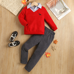 欧美跨境童装男童秋冬双色波斯螺纹翻领假两件+灯芯绒长裤两件套