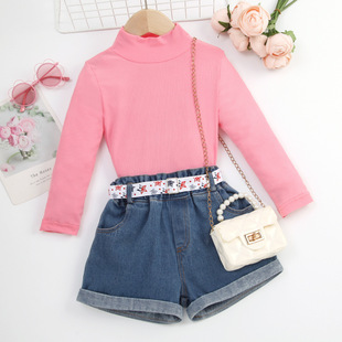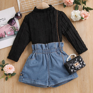 跨境童装女童秋冬纯色细坑条高领长袖套头衫花纹腰带牛仔短裤套装