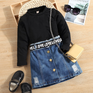 童装跨境女童春秋黑色长袖坑条针织套头衫+牛仔破洞A字短裙两件套