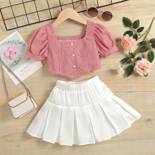 欧美跨境童装女童新款格子喇叭袖方领套头衫纯色拼接百褶裙两件套