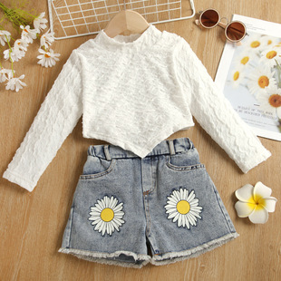 2022欧美跨境新品女童套装纯色纹路长袖套头衫花朵印花牛仔短裤
