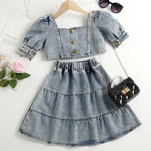 欧美跨境新款童装复古方领单排扣上衣缩筋拼接公主裙牛仔两件套