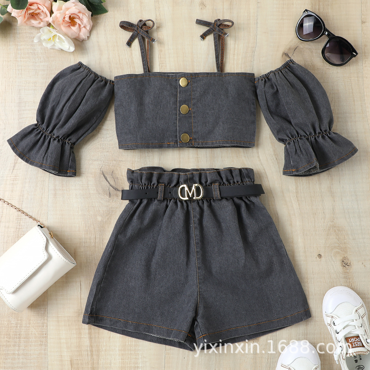 欧美跨境童装女童夏季缩筋领灯笼袖上衣碎花腰带破洞毛边牛仔套装