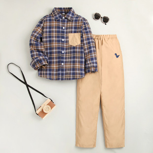 欧美跨境童装男童秋冬格子开衫翻领长袖衬衫纯色绣花长裤两件套