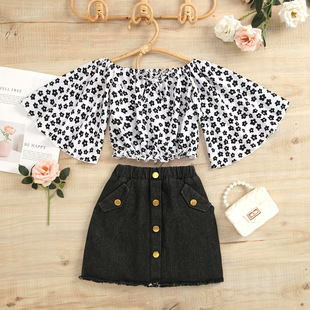 欧美跨境童装女童夏季缩筋宽领喇叭袖碎花上衣黑色单排扣牛仔短裙