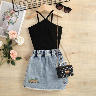 欧美跨境童装女童夏季纯色吊带坑条套头衫动物印花毛边牛仔短裙