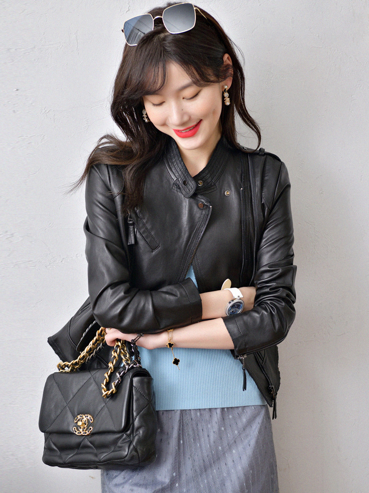 해닝 2025 신상 여성용 가죽 자켓, 짧은 양가죽 슬림핏 바이커 자켓스토어 가기