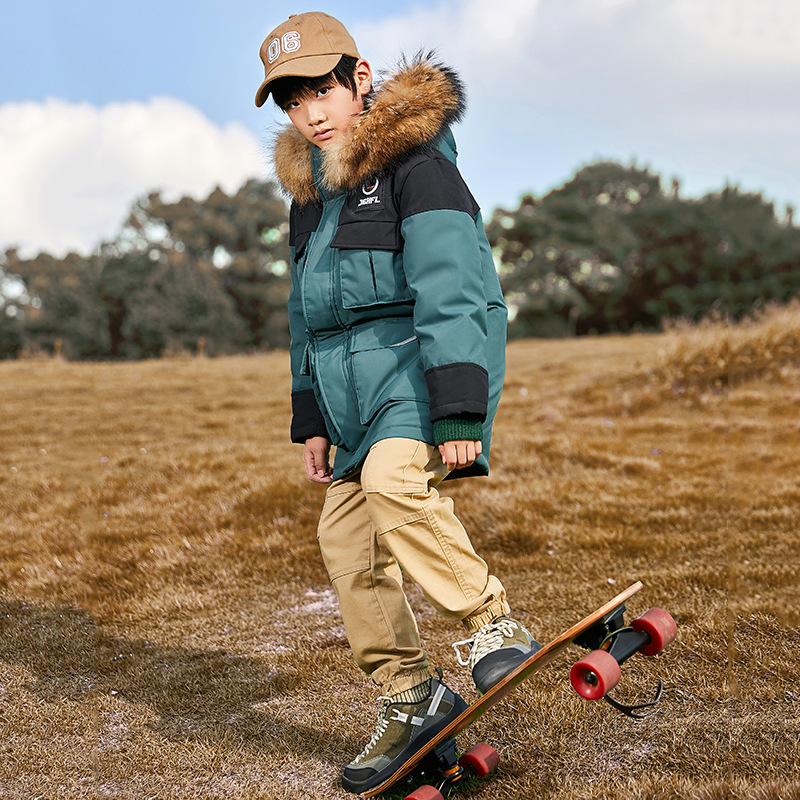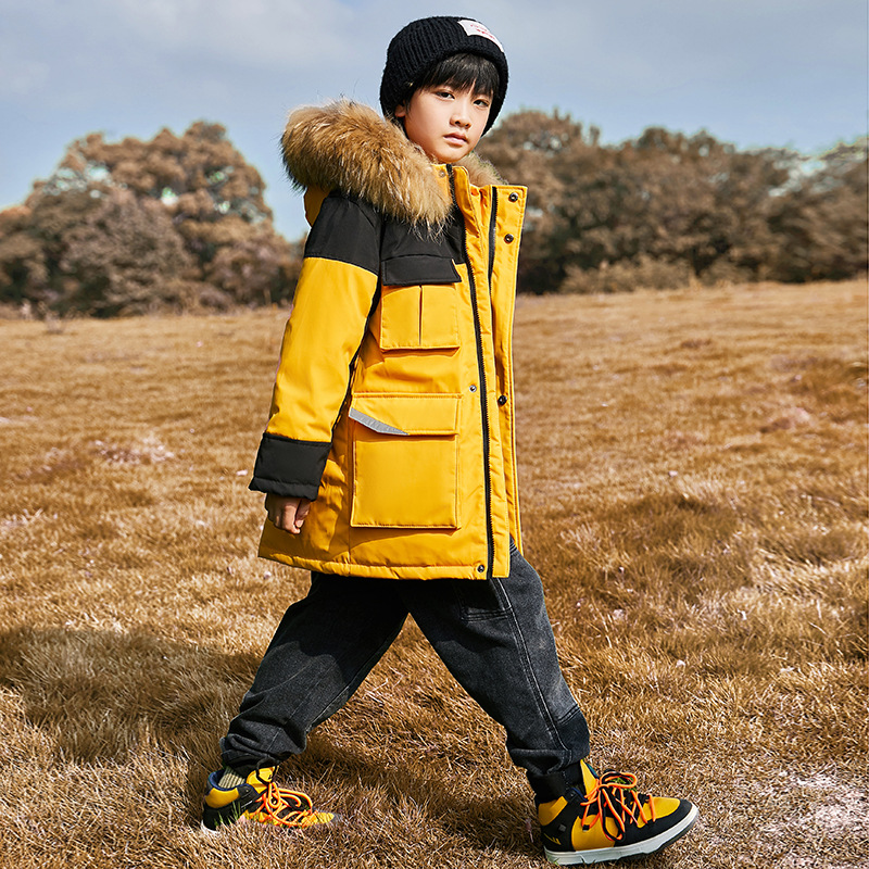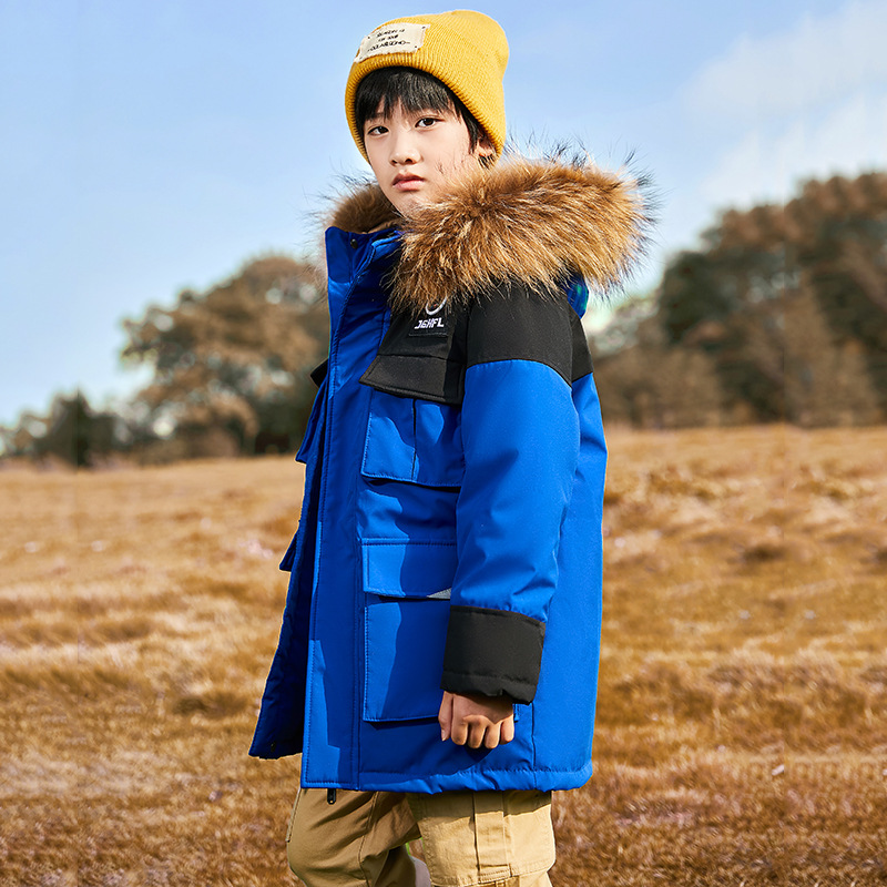 2024 새로운 어린이 다운 재킷 소년 중간 길이 모피 칼라 작업복 서양식 두꺼운 중형 및 대형 아동 코트 아동 의류스토어 가기