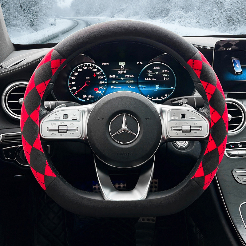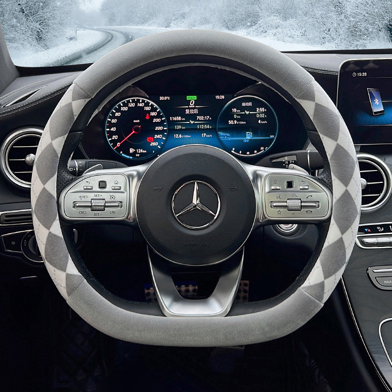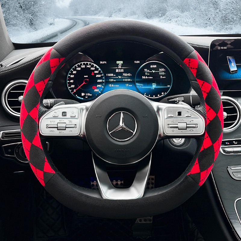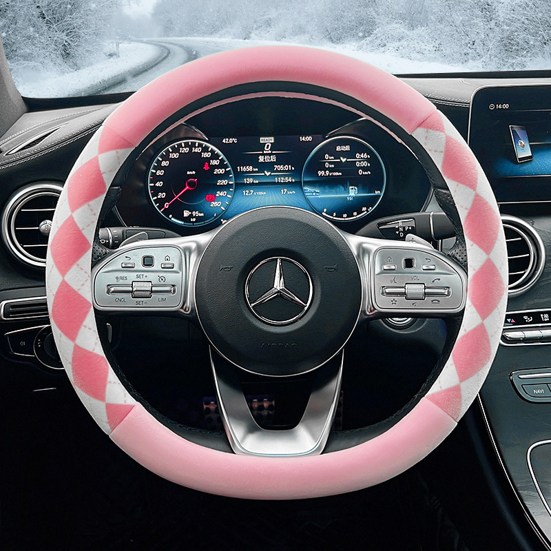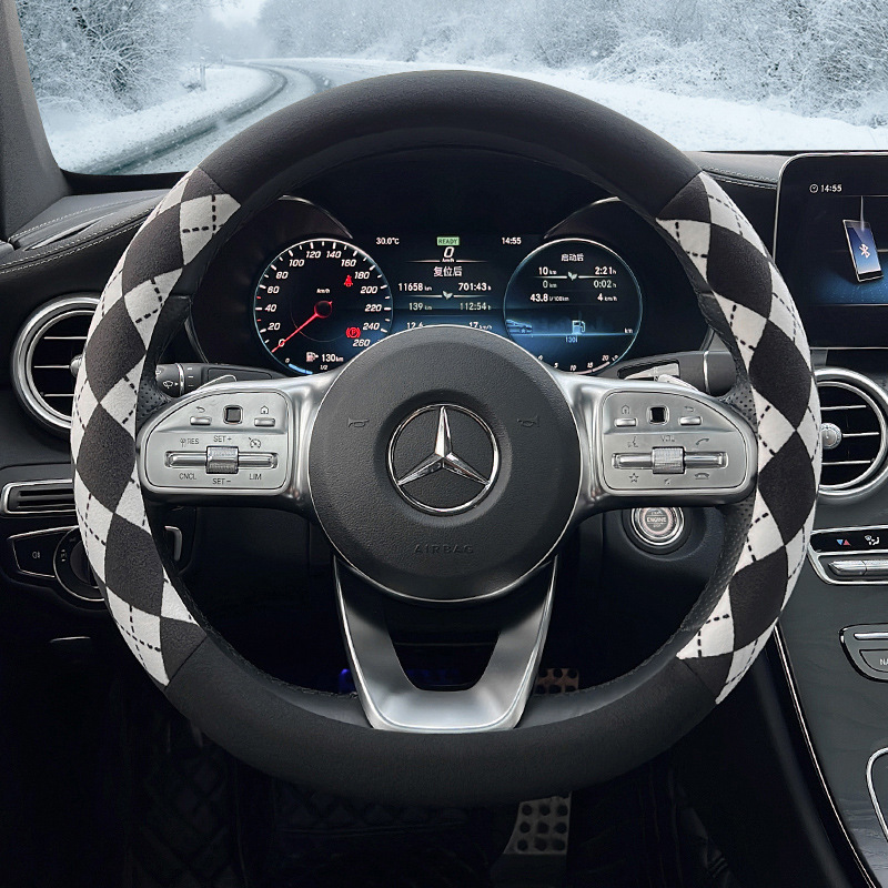 짧은 플러시 자동차 스티어링 휠 커버 자카드 다이아몬드 그리드 겨울 패션 핸들 커버 남성과 여성의 자동차 용품 스티어링 휠 커버 도매