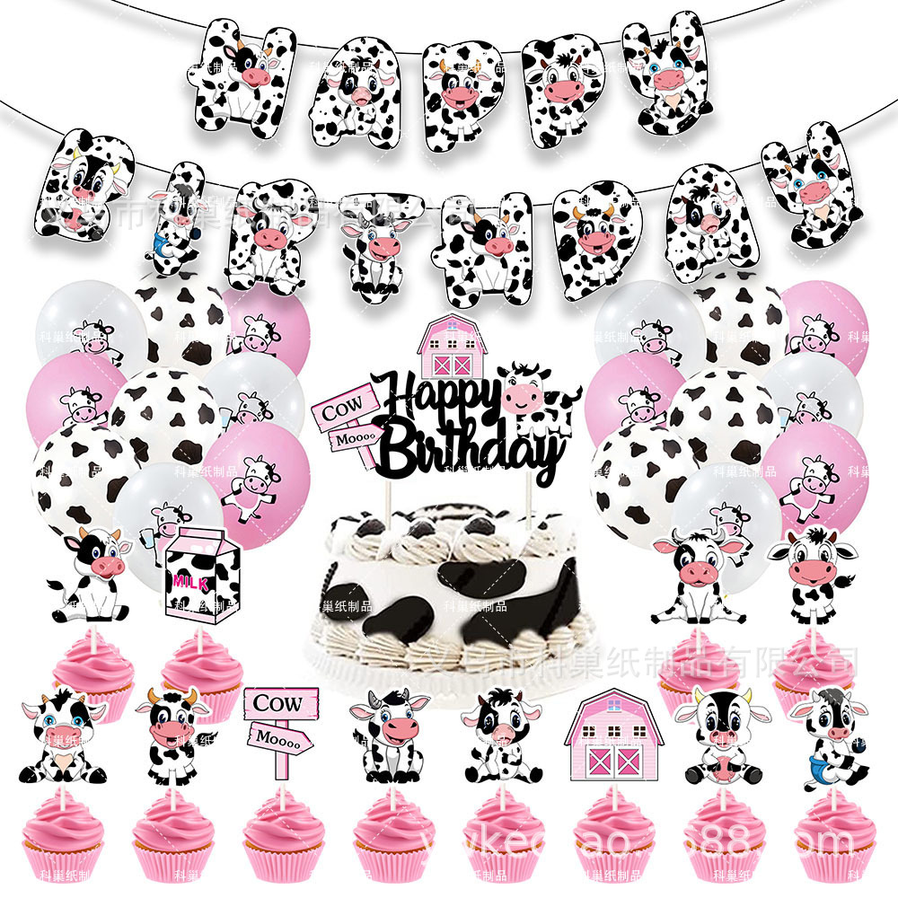 원래 소 테마 어린이 생일 파티 배경 장식 세트 생일 플래그 케이크 삽입 라텍스 풍선스토어 가기