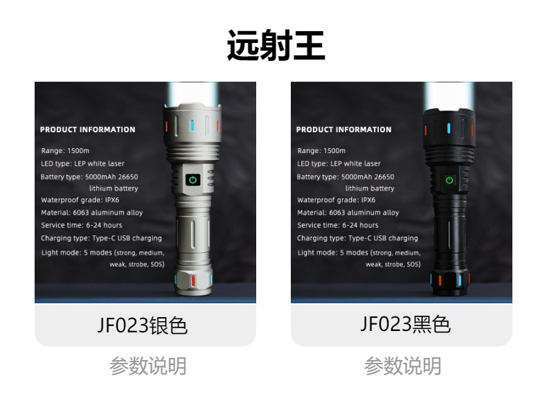 【工作档位】:5档(强、中、弱、爆闪、SOS)长按关机