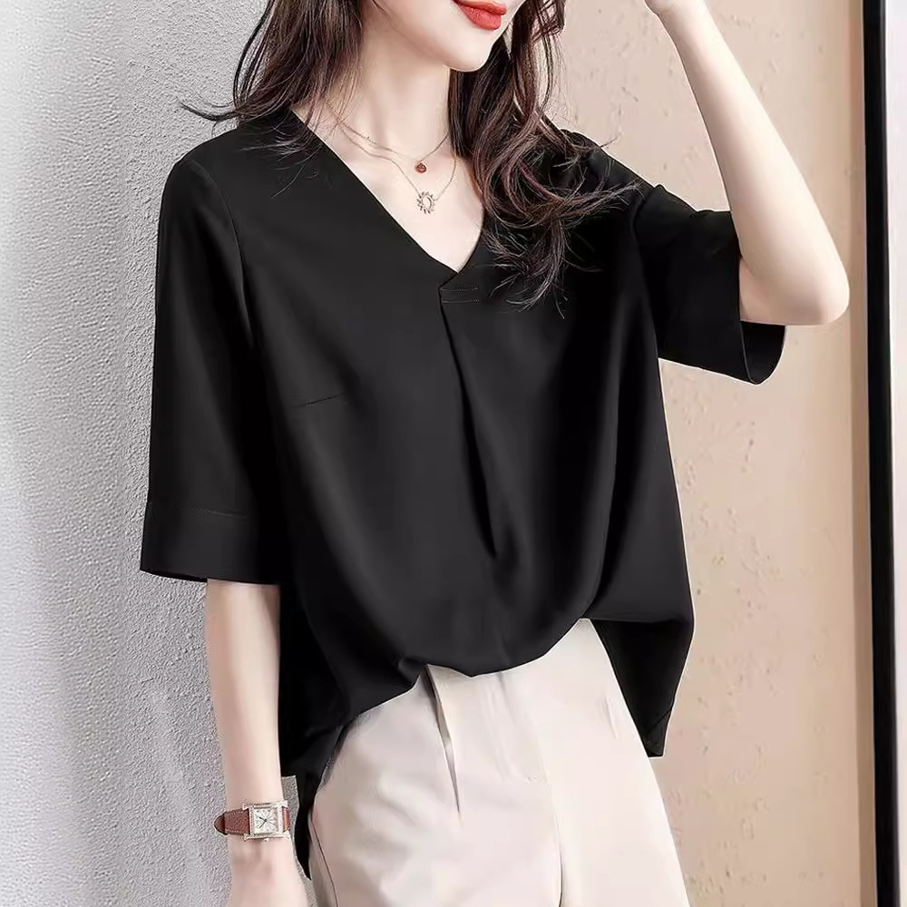 브이넥 반소매 쉬폰 셔츠 여자 2024 년 여름 새 한국 스타일 드래핑 느슨한 반소매 탑 여성용 셔츠 I