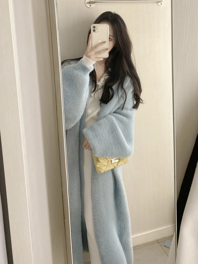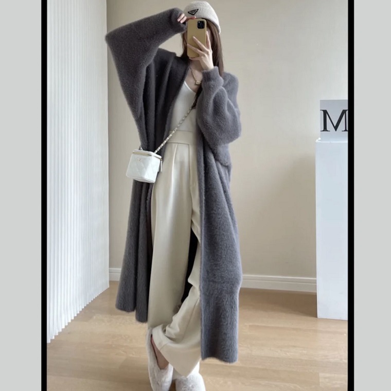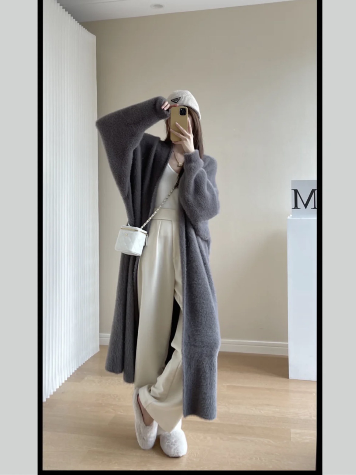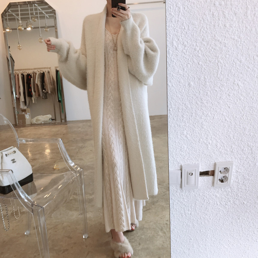 게으른 스타일 중간 길이 무릎 길이 밍크 양털 스웨터 코트 여성의 느슨한 가을과 겨울 빈티지 시크 니트 가디건 코트