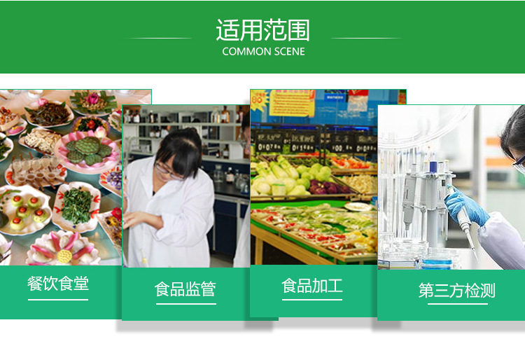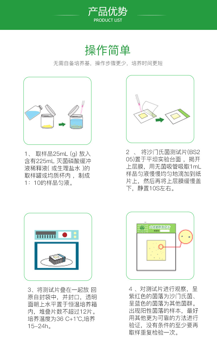 适用范围:沙门氏菌测试片(FilmplateTM Salmonella BS205)含有选择性培养基、沙门氏菌特有辛酯酶的显色指示剂和高分子吸水凝胶,运用微生物测试片专有技术,做成一次性快速检验产品,一步培养15~24h就可确认是否带有沙门氏菌,非常适合各级检验部门和食品企业使用。