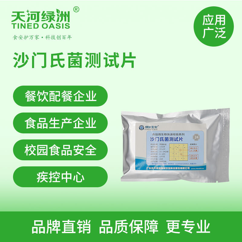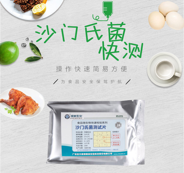 沙门氏菌属肠道细菌科,包括那些引起食物中毒、导致肠胃炎、伤寒和副伤寒的细菌。能引起食物传播性疾病,近年来,已经成为常见的食物中毒原因。肠炎沙门氏菌感染通常源于奶制品、禽产品和肉产品;鸡肉和鸡蛋尤其是高风险食品。沙门氏菌感染的症状通常是肠胃出现问题,包括恶心、腹部绞痛、呕吐和腹泻,一般可持续7 天。在免疫力低下的人群中,如果不及时服用抗生素类药品,沙门氏菌感染将导致生命危险。沙门氏菌测试片(FilmplateTM Salmonella BS205)含有选择性培养基、沙门氏菌特有辛酯酶的显色指示剂和高分子吸水凝胶,运用微生物测试片专有技术,做成一次性快速检验产品,一步培养15~24h就可确认是否带有沙门氏菌,非常适合各级检验部门和食品企业使用。本产品适用于肉和肉产品、蛋及蛋制品、冷饮等的快速检测。参照标准:食品安全国家标准食品微生物学检验沙门氏菌检验(GB/T4789.4-2010)。