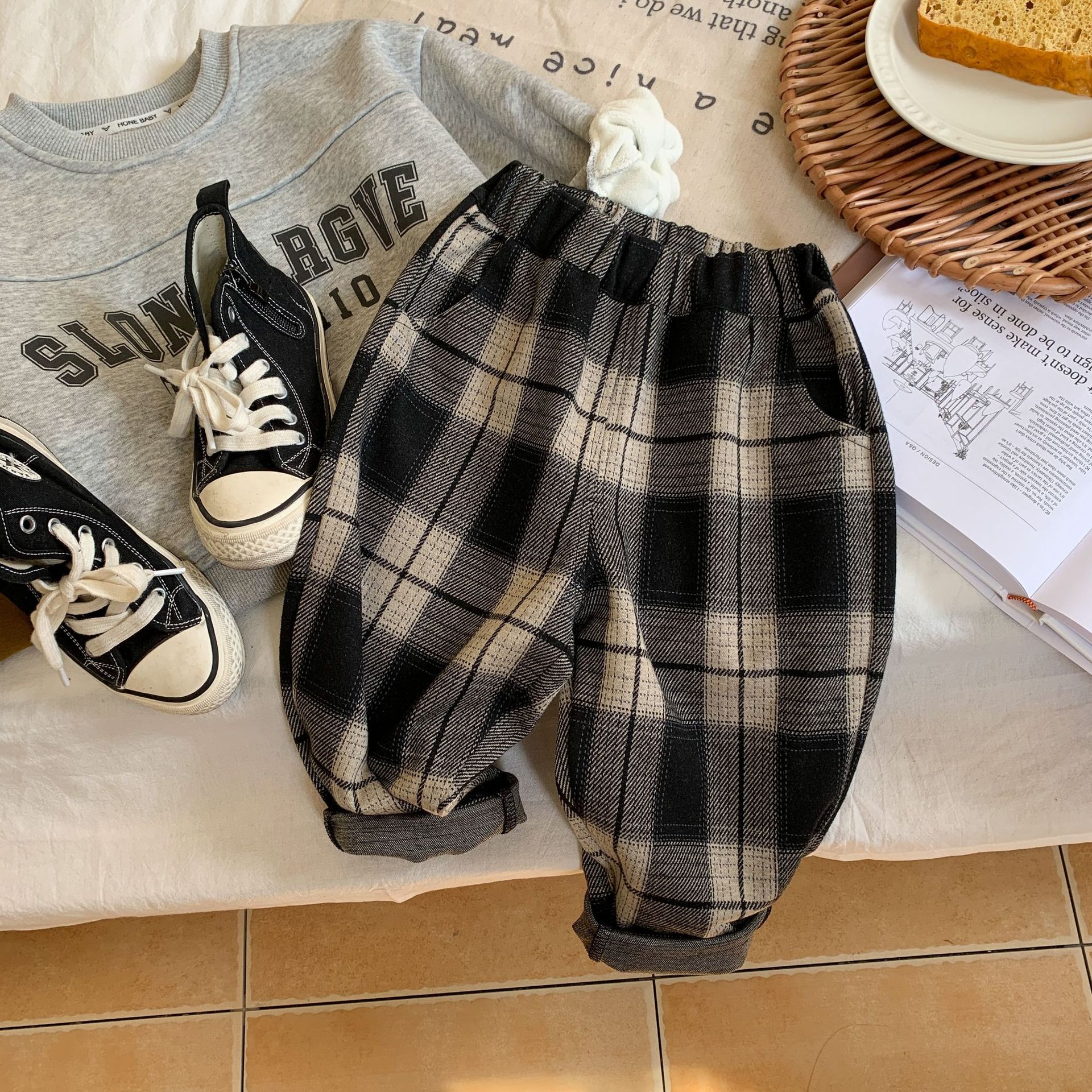 아동 바지 2025 Bangcheng 가을 새로운 소년과 소녀 클래식 격자 무늬 캐주얼 바지 아기 다목적 바지 C0333
