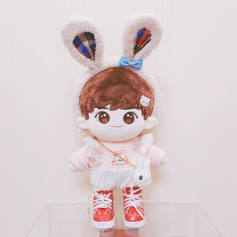 • Qian Xi + 라이트 블루 스트랩 바지 세트 + 토끼 가방 데님 신발 + 블루 웃는 얼굴 모자