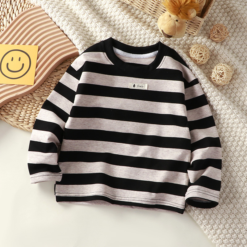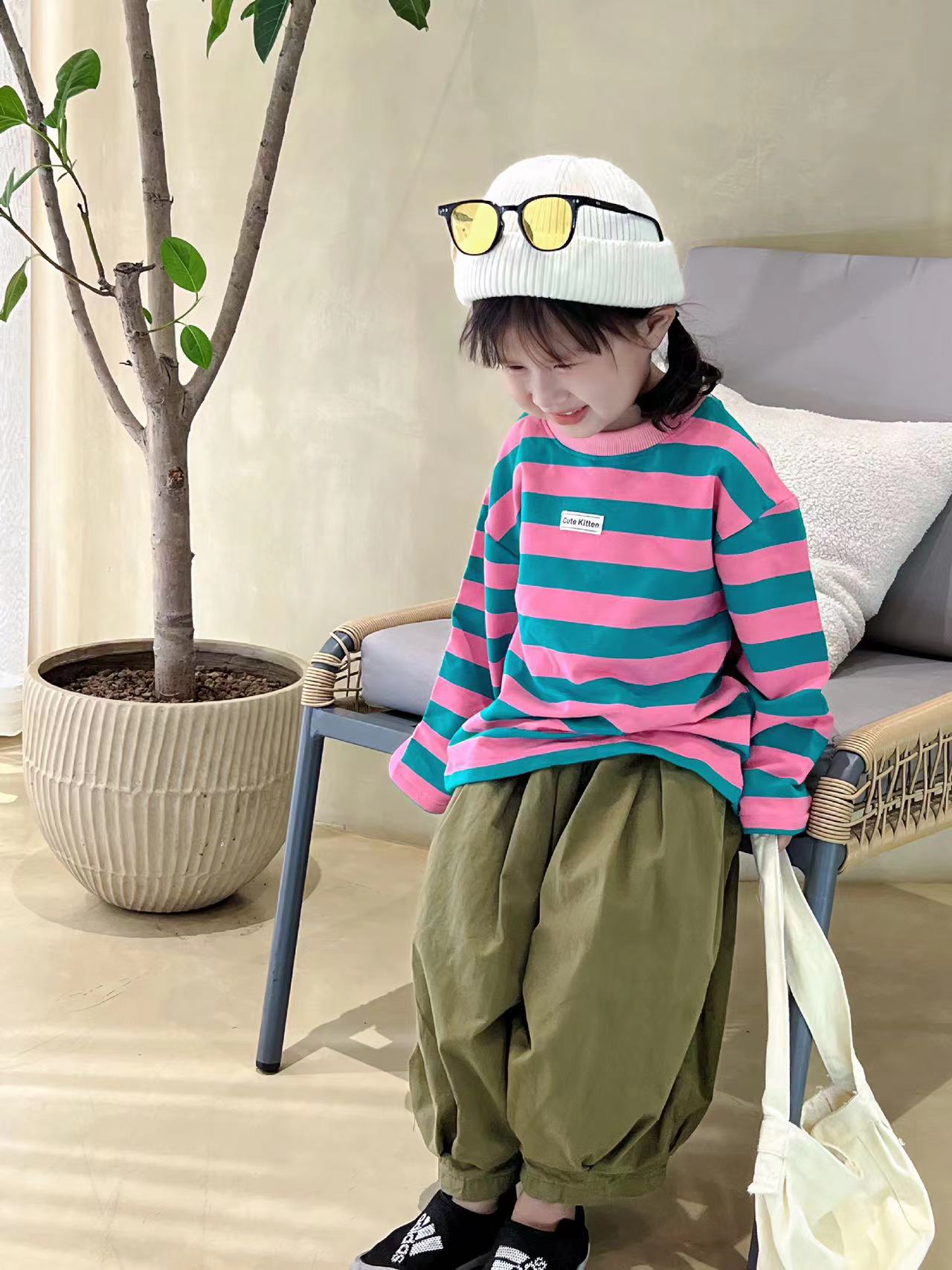 가을 2023 새로운 소년 소녀 긴 소매 기본 셔츠 어린이 한국 패션 스트라이프 라운드 넥 느슨한 스트라이프 스웨터스토어 가기