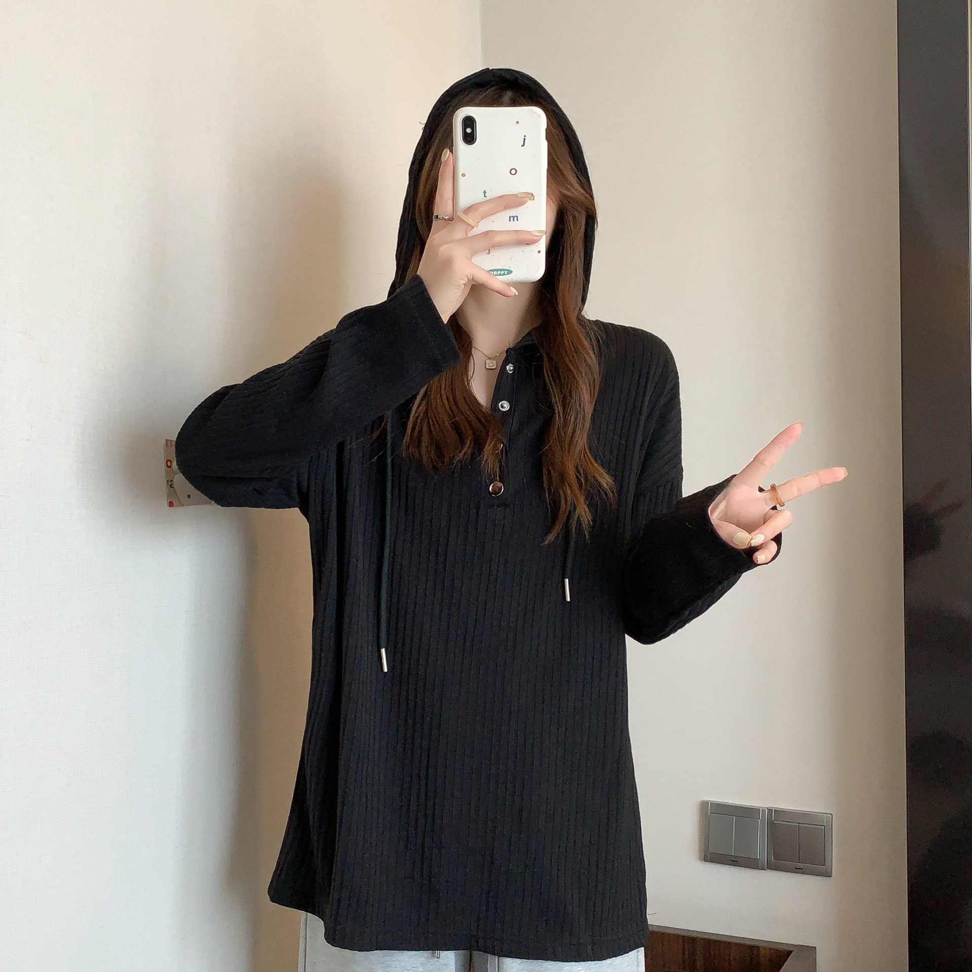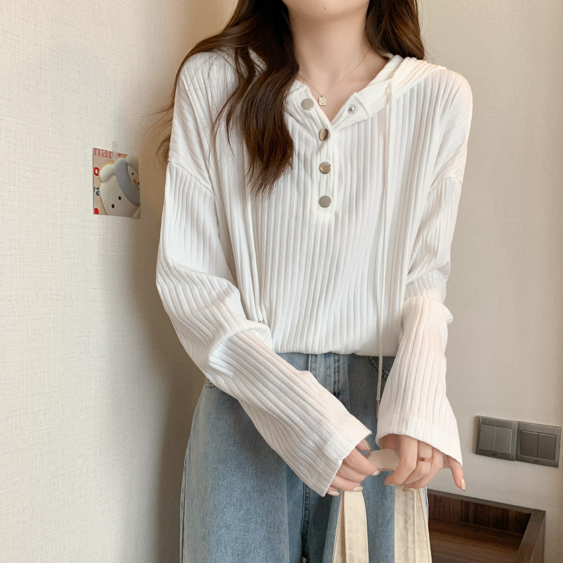 봄과 가을 디자인 느슨한 긴팔 바닥 셔츠 탑 슬리밍 버튼 여성을위한 도매 솔리드 컬러 핏 스트라이프 후드 티셔츠스토어 가기