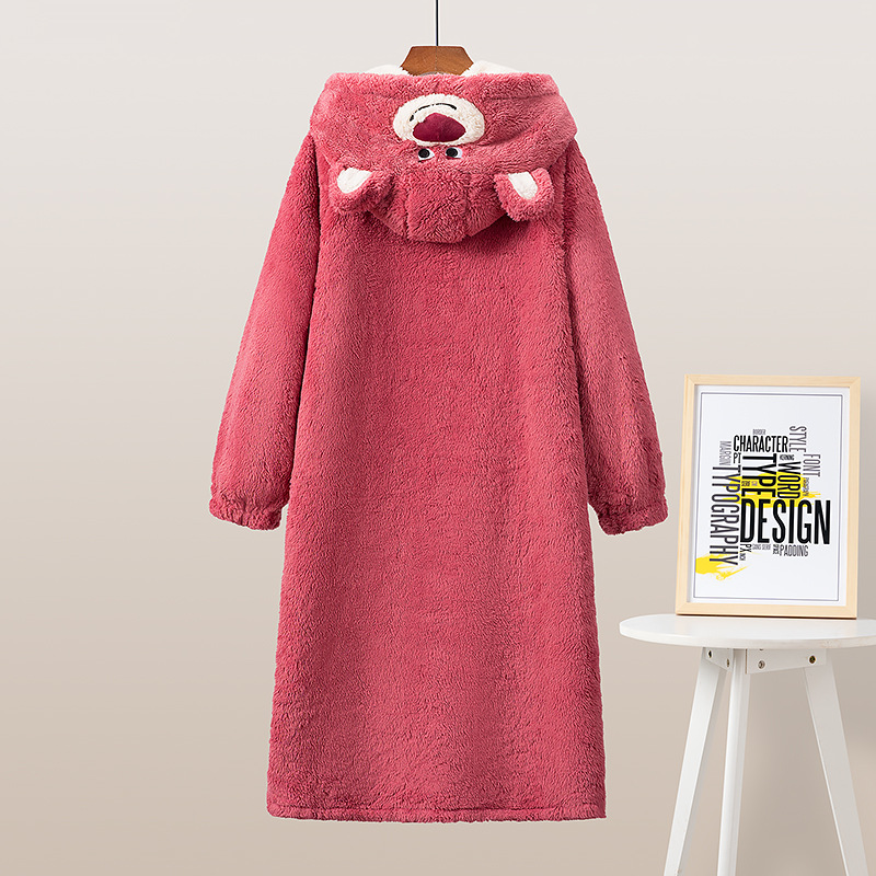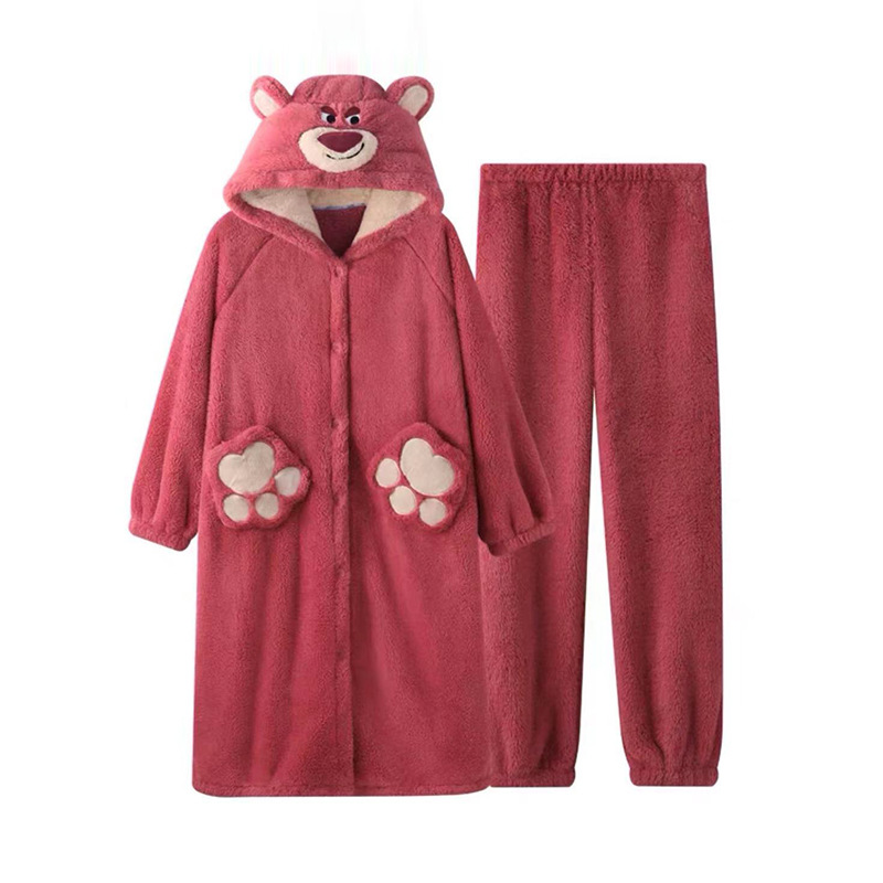 2022 딸기 곰 잠옷 가을과 겨울 산호 양털 두꺼운 기모 아웃웨어 여성의 새로운 귀여운 가정 의류 세트스토어 가기