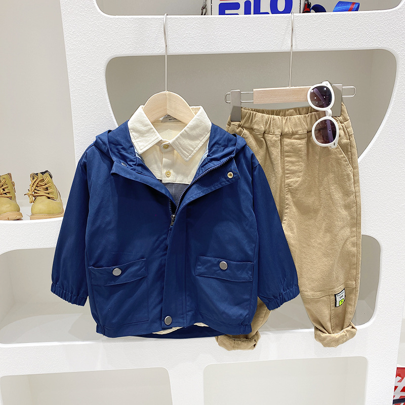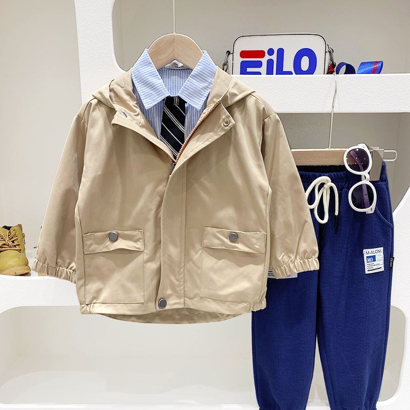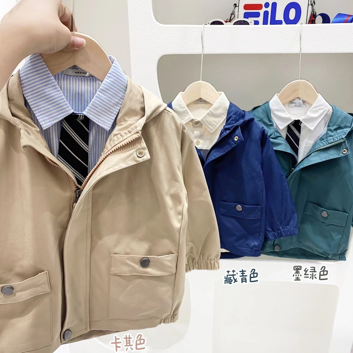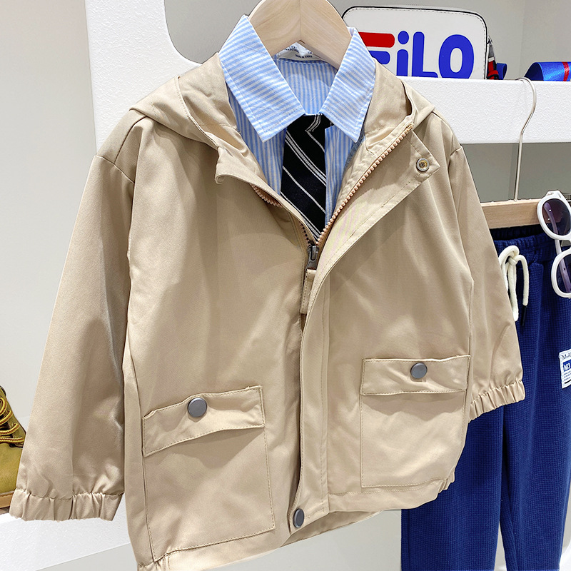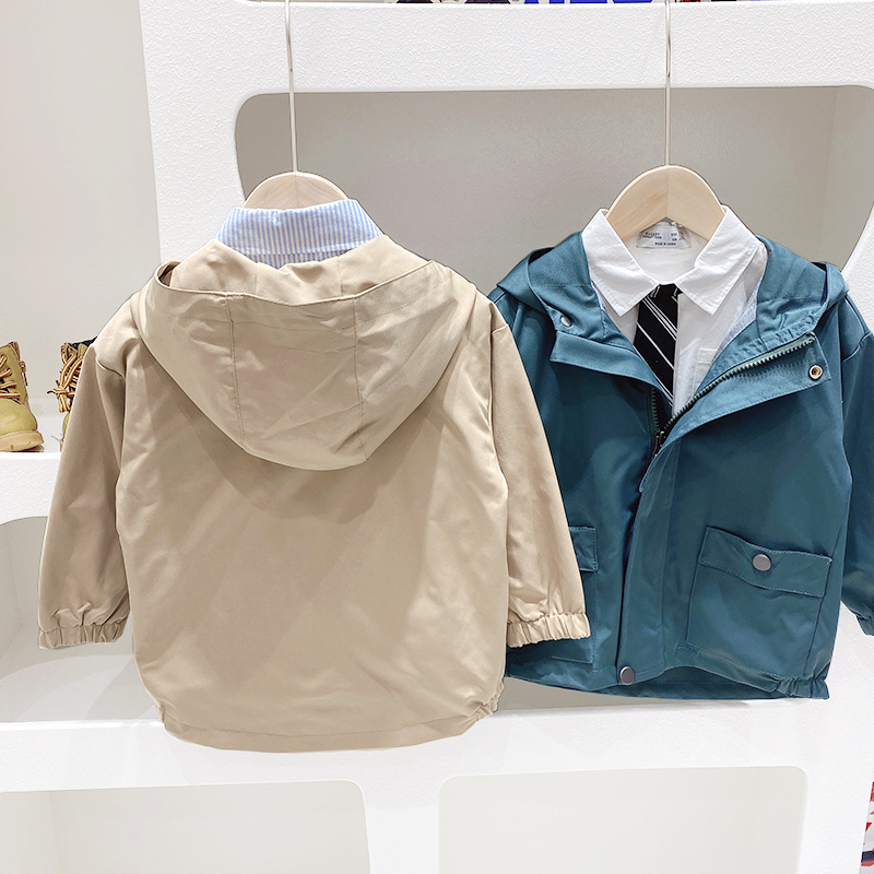2022 가을 아동 의류 소년과 어린이 단색 간단한 영국 스타일 후드 어린이 코트 윈드 브레이커 의류 도매스토어 가기