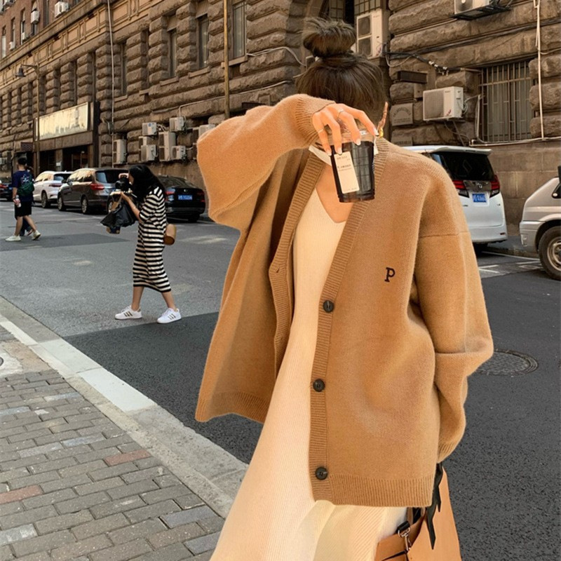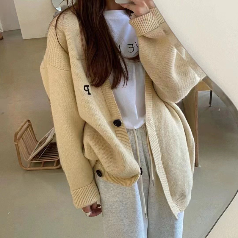 한국 동대문 2022 새로운 복고풍 게으른 느슨한 긴 소매 니트 카디건 편지 자수 스웨터 재킷