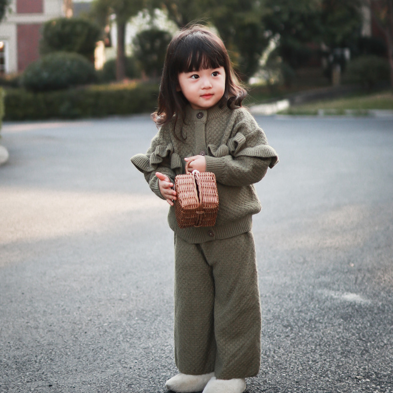 거대한 개구리 머리 칼라 2022 새로운 귀여운 여아 스웨터 니트 여아 두꺼운 카디건 와이드 레그 바지 세트