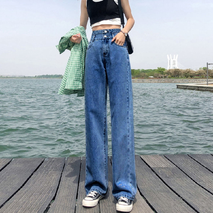 2023 가을 새로운 걸레 청바지 여성의 높은 허리 더블 버클 느슨한 슬리밍 유행 드레이핑 넓은 다리 스트레이트 팬츠 패션스토어 가기