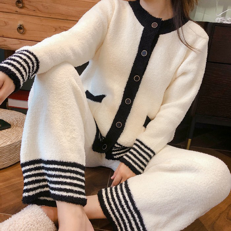 달콤한 캐주얼 샤넬 스타일 카디건 긴팔 잠옷 여성의 가을과 겨울 부드러운 두꺼운 산호 양털 가정 옷 세트