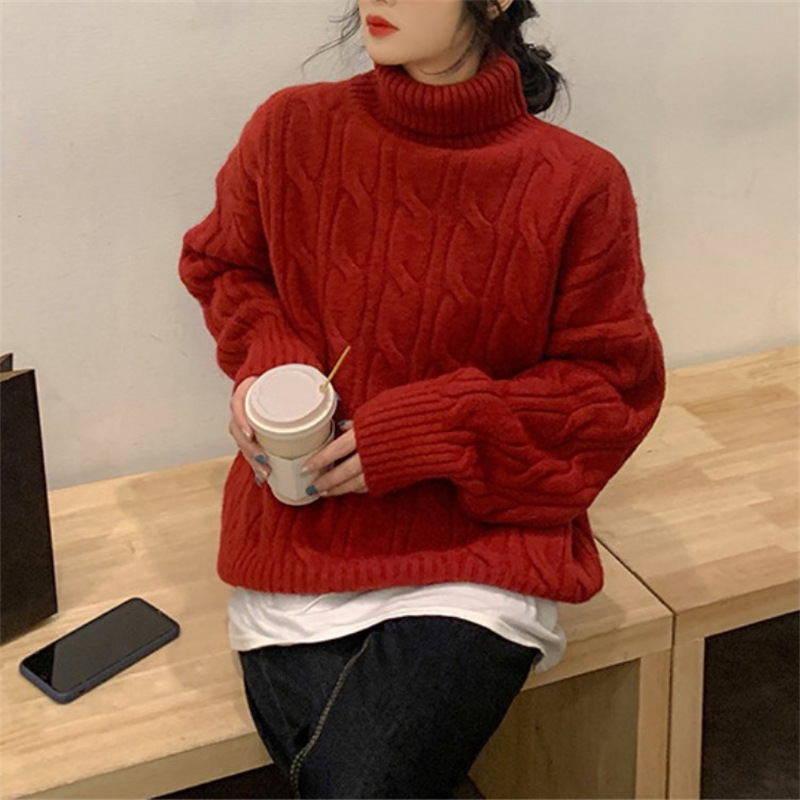여성용 하이넥 소프트 왁시 스웨터 2025 가을 겨울 신상 루즈 풀오버 트위스트 니트 스웨터, 레이지 스타일 솔리드 컬러 베이스 레이어 스웨터
