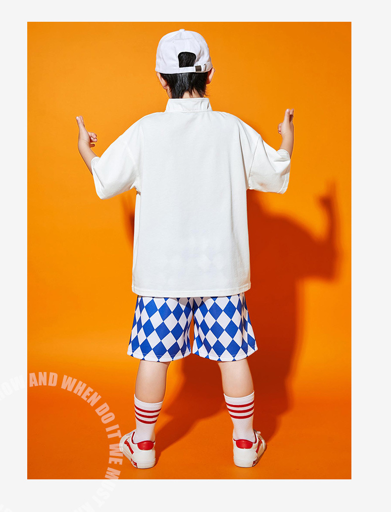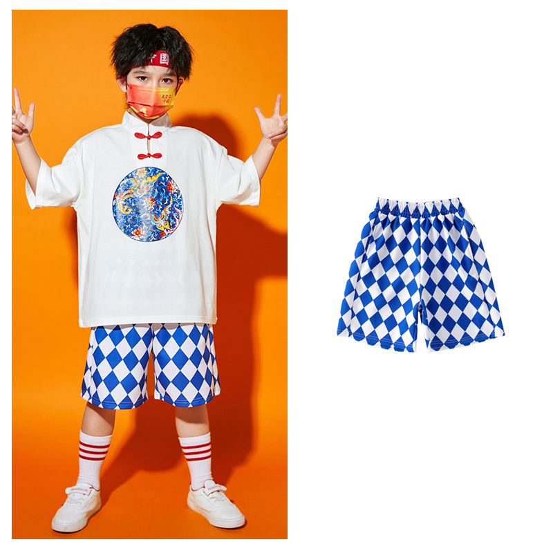 • 8801 흰색 반팔 + 8261 파란색 격자 무늬 반바지 + 중국 머리띠